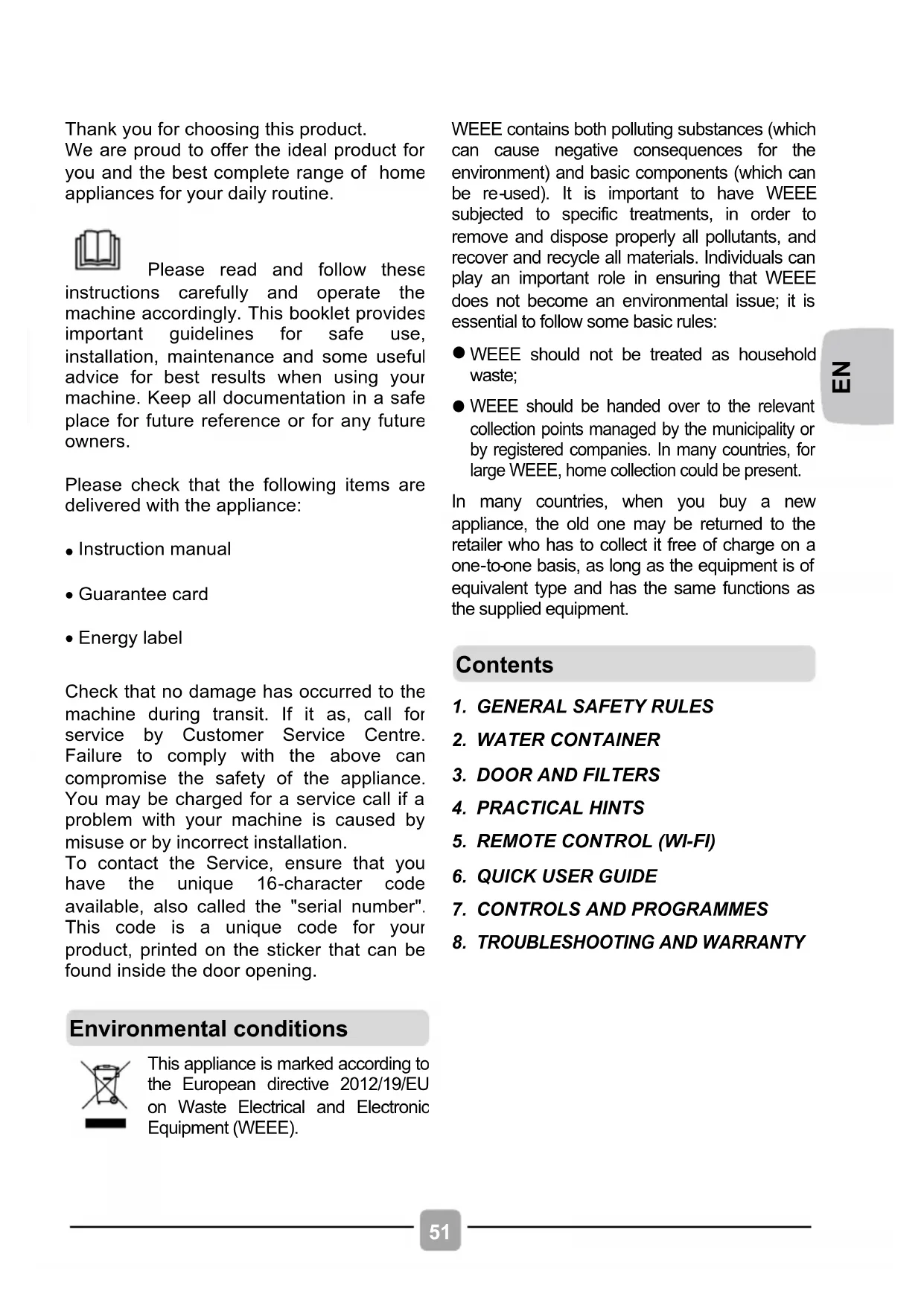 Please read and follow these instructions carefully and operate the machine accordingly. This booklet provides important guidelines for safe use, installation, maintenance and some useful advice for best results when using your machine. Keep all documentation in a safe place for future reference or for any future owners.