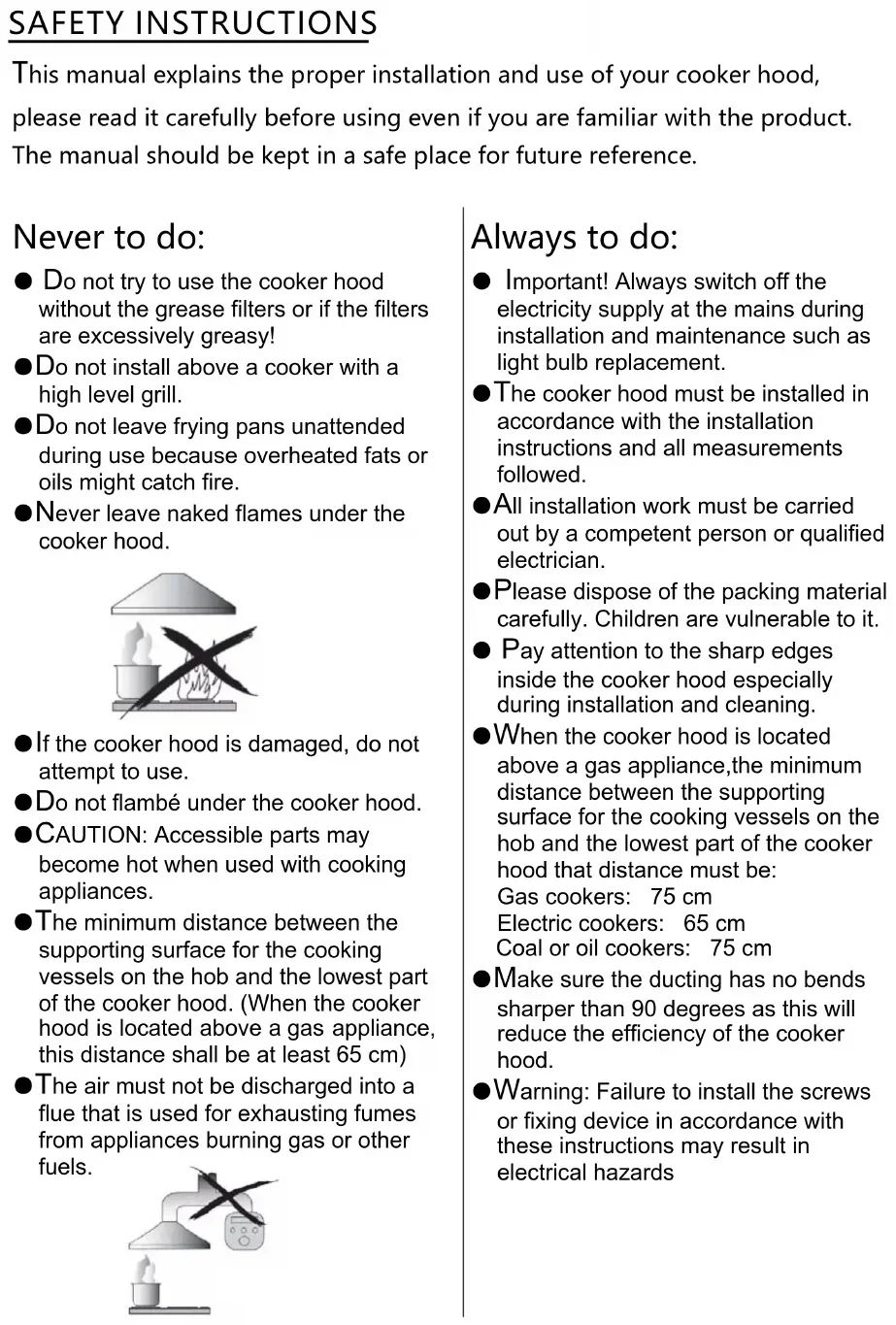2SAFETY INSTRUCTIONS This manual explains the proper installation and use of your cooker hood, please read it carefully before using even if you are familiar with the product. The manual should be kept in a safe place for future reference. Never to do: ● Do not try to use the cooker hood without the grease filters or if the filters are excessively greasy! ●Do not install above a cooker with a high level grill. ●Do not leave frying pans unattended during use because overheated fats or oils might catch fire. ●Never leave naked flames under the cooker hood. ●If the cooker hood is damaged, do not attempt to use. ●Do not flambé under the cooker hood. ●CAUTION: Accessible parts may become hot when used with cooking appliances. ●The minimum distance between the supporting surface for the cooking vessels on the hob and the lowest part of the cooker hood. (When the cooker hood is located above a gas appliance, this distance shall be at least 65 cm) ●The air must not be discharged into a flue that is used for exhausting fumes from appliances burning gas or other fuels. Always to do: ● Important! Always switch off the electricity supply at the mains during installation and maintenance such as light bulb replacement. ●The cooker hood must be installed in accordance with the installation instructions and all measurements followed. ●All installation work must be carried out by a competent person or qualified electrician. ●Please dispose of the packing material carefully. Children are vulnerable to it. ● Pay attention to the sharp edges inside the cooker hood especially during installation and cleaning. ●When the cooker hood is located above a gas appliance,the minimum distance between the supporting surface for the cooking vessels on the hob and the lowest part of the cooker hood that distance must be: Gas cookers: 75 cm Electric cookers: 65 cm Coal or oil cookers: 75 cm ●Make sure the ducting has no bends sharper than 90 degrees as this will reduce the efficiency of the cooker hood. ●Warning: Failure to install the screws or fixing device in accordance with these instructions may result in electrical hazards 3Always to do: ●Always put lids on pots and pans when cooking on a gas cooker. ●When in extraction mode, air in the room is being removed by the cooker hood. Please make sure that proper ventilation measures are being observed. The cooker hood removes odours from room but not steam. ●Cooker hood is for domestic use only. ●If the supply cord is damaged, it must be replaced by the manufacturer, its service agent or similarly qualified persons in order to avoid a hazard. ●This appliance can be used by children aged from 8 years and above and persons with reduced physical, sensory or mental capabilities or lack of experience and knowledge if they have been given supervision or instruction concerning use of the appliance in a safe way and understand the hazards involved. Children shall not play with the appliance. Cleaning and user maintenance shall not be made by children without supervision. ●Warning: Before obtaining access to terminals, all supply circuits must be disconnected. Always to do: ● Caution: The appliance and its accessible parts can become hot during operation. Be careful to avoid touching the heating elements. Children younger than 8 years old should stay away unless they are under permanent supervision. ● There shall be adequate ventilation of the room when the cooker hood is used at the same time as appliances burning gas or other fuels. ●There is a fire risk if cleaning is not carried out in accordance with the instructions ●Regulations concerning the discharge of air have to be fulfilled. ●Clean your appliance periodically by following the method given in the chapter MAINTENANCE. ●For safety reason, please use only the same size of fixing or mounting screw which are recommended in this instruction manual. ●Regarding the details about the method and frequency of cleaning, please refer to maintenance and cleaning section in the instruction manual. ●Cleaning and user maintenance shall not be made by children without supervision. ●When the cooker hood and appliances supplied with energy other than electricity are simultaneously in operation, the negative pressure in the room must not exceed 4 Pa (4 x 10-5 bar). ●WARNING: Danger of fire: do not store items on the cooking surfaces. ●A steam cleaner is not to be used. ●NEVER try to extinguish a fire with water, but switch off the appliance and then cover flame e.g. with a lid or a fire blanket. 4INSTALLATION (VENT OUTSIDE)