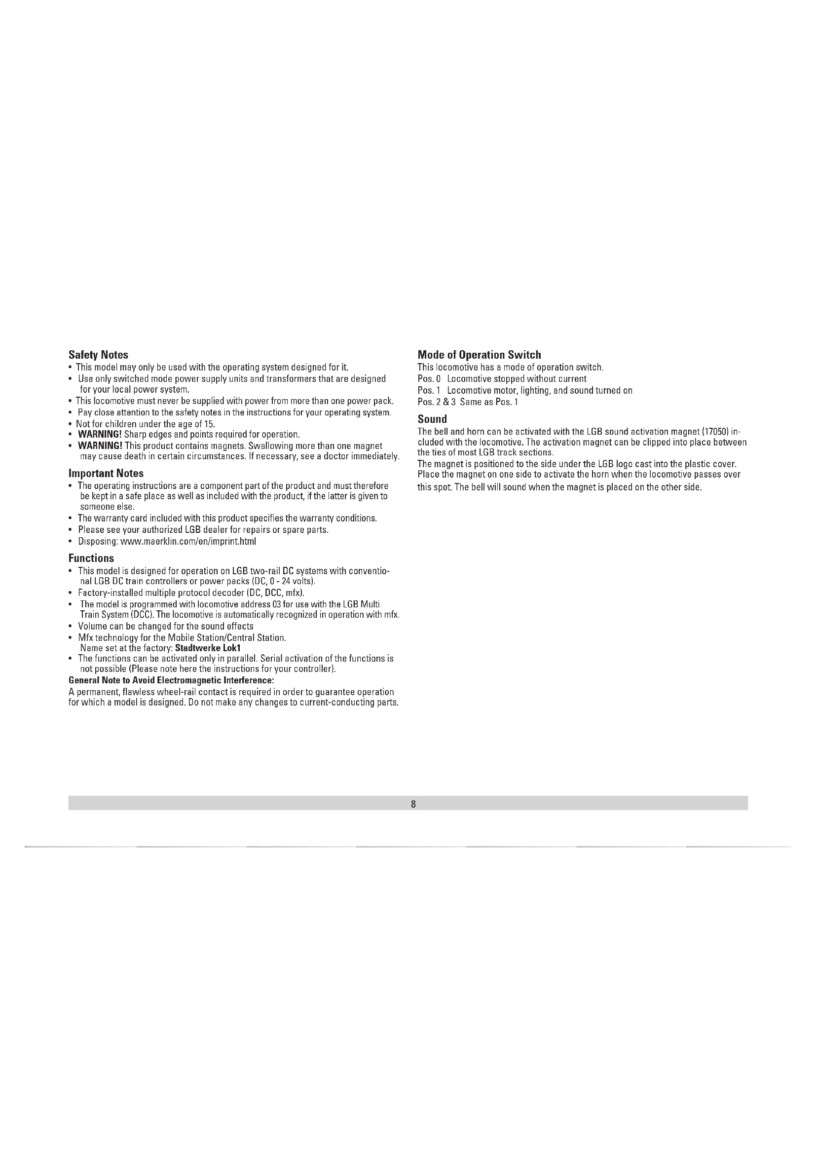- The functions can be activated only in parallel. Serial activation of the functions is not possible (Please note here the instructions for your controller). General Note to Avoid Electromagnetic Interference: A permanent, flawless wheel-rail contact is required in order to guarantee operation for which a model is designed. Do not make any changes to current-conducting parts. Mode of Operation Switch This locomotive has a mode of operation switch. Pos. 0 Locomotive stopped without current Pos. 1 Locomotive motor, lighting, and sound turned on Pos. 2 & 3 Same as Pos. 1 Sound The bell and horn can be activated with the LGB sound activation magnet (17050) in- cluded with the locomotive. The activation magnet can be clipped into place between the ties of most LGB track sections. The magnet is positioned to the side under the LGB logo cast into the plastic cover. Place the magnet on one side to activate the horn when the locomotive passes over this spot. The bell will sound when the magnet is placed on the other side.9 Multi-Protocol Operation Analog Operation This decoder can also be operated on analog layouts or areas of track that are analog. The decoder recognizes alternating current (DC) and automatically adapts to the analog track voltage. All functions that were set under mfx or DCC for analog operation are active (see Digital Operation). The built-in sound functions come from the factory inactive for analog operation. Digital Operation The decoders are multi-protocol decoders. These decoders can be used under the following digital protocols: mfx or DCC. The digital protocol with the most possibilities is the highest order digital protocol. The sequence of digital protocols in descending order is: Priority 1: mfx; Priority 2: DCC; Priority 3: DC Note: Digital protocols can influence each other. For trouble-free operation, we re- commend deactivating those digital protocols not needed by using CV 50. Deactivate unneeded digital protocols at this CV if your controller supports this function. If two or more digital protocols are recognized in the track, the decoder automatically takes on the highest order digital protocol, example: mfx/DCC; the decoder takes on the mfx digital protocol (see previous table). Note: Please note that not all functions are possible in all digital protocols. Several settings for functions, which are supposed to be active in analog operation, can be done under mfx and DCC. Notes on digital operation