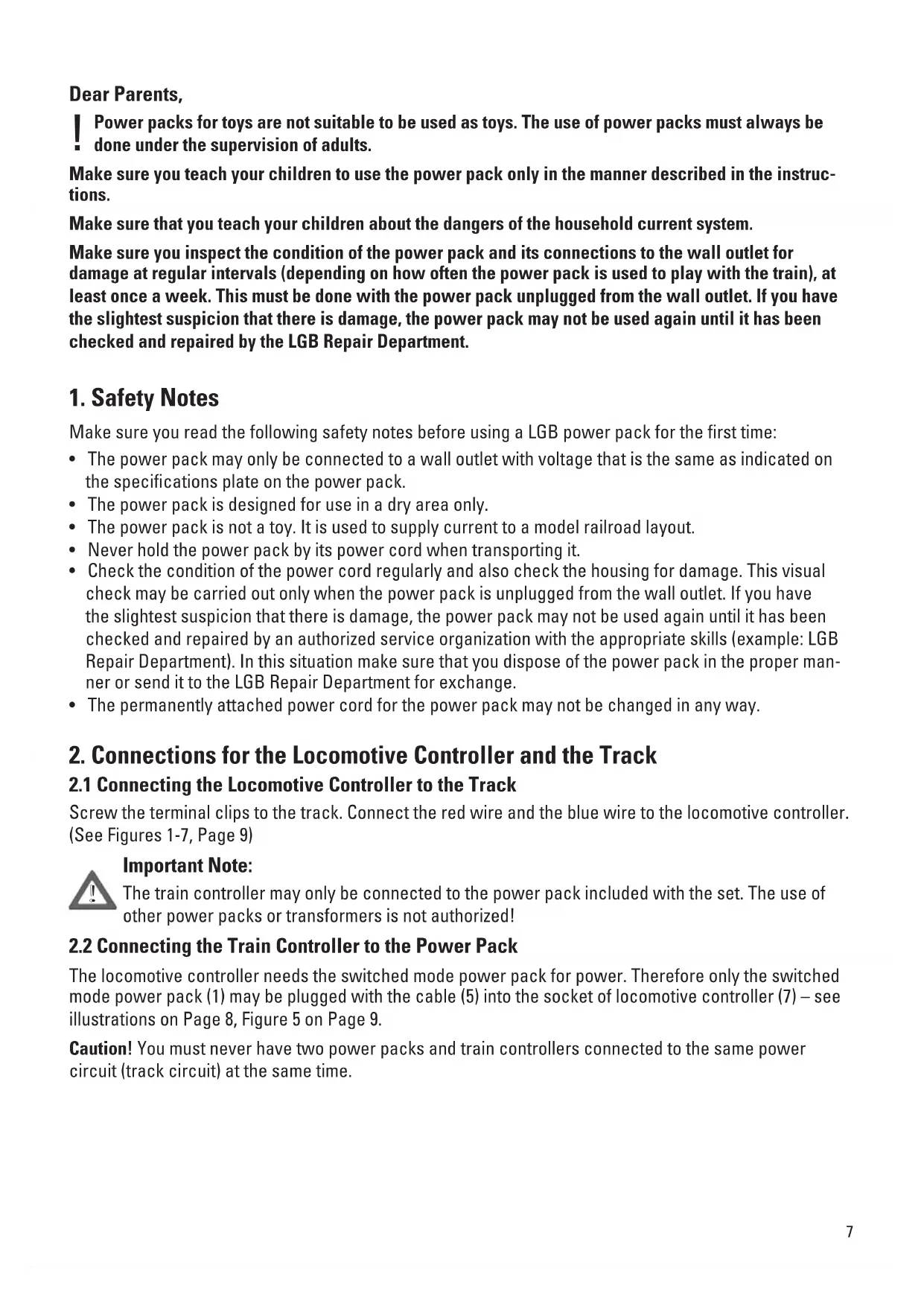 - The permanently attached power cord for the power pack may not be changed in any way. Dear Parents, Power packs for toys are not suitable to be used as toys. The use of power packs must always be done under the supervision of adults. Make sure you teach your children to use the power pack only in the manner described in the instruc- tions. Make sure that you teach your children about the dangers of the household current system. Make sure you inspect the condition of the power pack and its connections to the wall outlet for damage at regular intervals (depending on how often the power pack is used to play with the train), at least once a week. This must be done with the power pack unplugged from the wall outlet. If you have the slightest suspicion that there is damage, the power pack may not be used again until it has been checked and repaired by the LGB Repair Department.