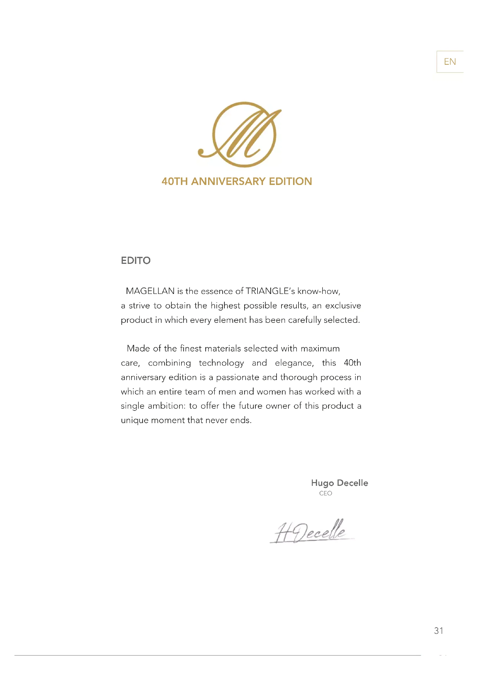 EDITO MAGELLAN is the essence of TRIANGLE’s know-how, a strive to obtain the highest possible results, an exclusive product in which every element has been carefully selected. Made of the nest materials selected with maximum care, combining technology and elegance, this 40th anniversary edition is a passionate and thorough process in which an entire team of men and women has worked with a single ambition: to offer the future owner of this product a unique moment that never ends. Hugo Decelle CEO