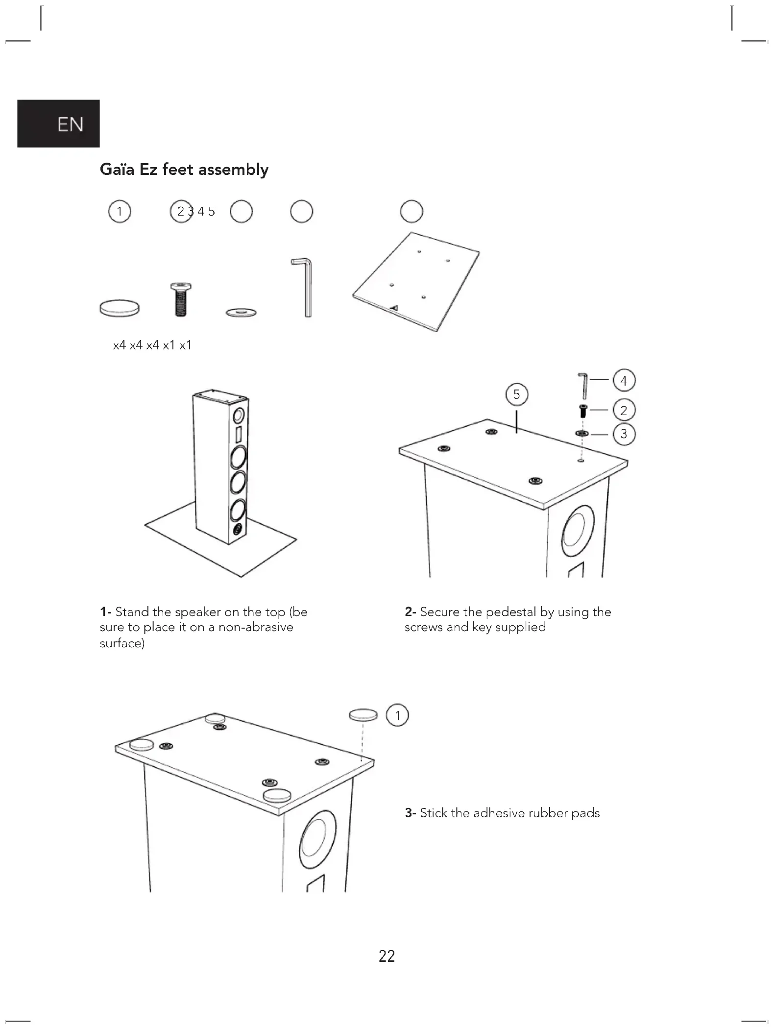 USER MANUAL ENGLISH EN20 Unpackging Open the box and remove all staples, then carefully take the speaker out of the box. When unpacking, if you notice any defects on any of the drivers or the cabinet, you should contact your dealer. Before disposing the packaging, check that nothing is left inside. Titus & Comète Ez feet assembly Stick the adhesive rubber pads