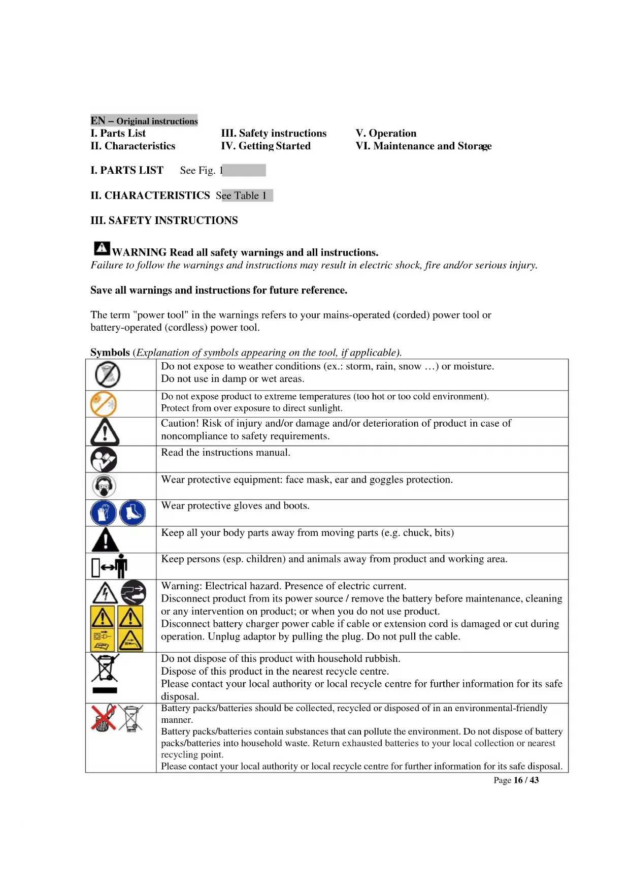 WARNING Read all safety warnings and all instructions. Failure to follow the warnings and instructions may result in electric shock, fire and/or serious injury. Save all warnings and instructions for future reference. The term "power tool" in the warnings refers to your mains-operated (corded) power tool or battery-operated (cordless) power tool. Symbols (Explanation of symbols appearing on the tool, if applicable). Do not expose to weather conditions (ex.: storm, rain, snow …) or moisture. Do not use in damp or wet areas. Do not expose product to extreme temperatures (too hot or too cold environment). Protect from over exposure to direct sunlight. Caution! Risk of injury and/or damage and/or deterioration of product in case of noncompliance to safety requirements. Read the instructions manual. Wear protective equipment: face mask, ear and goggles protection. Wear protective gloves and boots.