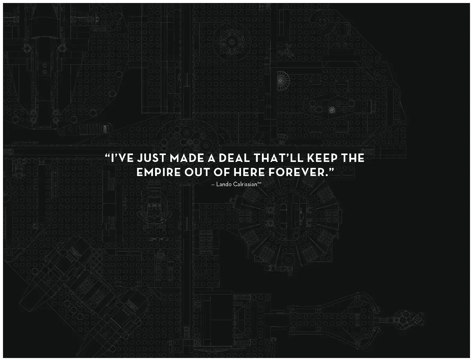 set? One could say I started early! Years before it was even decided to develop a new Cloud City, I built a small-scale Slave I, Boba Fett’s ship, with a later Bespin set in mind. As a LEGO Star Wars fan and collector myself, Cloud City was always at the top of my personal wish list, so I began thinking about different concepts early on. To me, Slave I belongs to Cloud City. Any play set just wouldn’t feel complete without it. Later in the design process I realized that I had to make room inside to store the block of carbonite with frozen Han Solo™—how could Boba Fett™ transport his bounty otherwise? This was quite a challenge with such a small model! What reference materials did you use? The main source of reference and inspiration were screenshots from Episode V, THE EMPIRE STRIKES BACK. It is interesting to see how light conditions change on the movie set, which affects the colors of some areas. I believe it is early morning when our heroes arrive. Then the day goes by, and when they make their escape the sun is just setting. This was important to keep in mind when choosing colors for the landing platform, for example—I know it really is plain gray, but we never see it like this in the movie. This is why I went with warmer tan and dark tan colors for this area. Hans Burkhard Schlömer What is uniquely inspirational about the Cloud City setting? To me as a designer, the movie’s set design is simply amazing. It is a very subtle art deco style. There are so many little details to discover once one starts paying attention. I wanted to have those details in my set. All of them! The mood and colors also change when moving from one area to the next. It is like a color code! While rooms and corridors initially are mostly white, open and airy, this quickly gives way to an oppressive dark red when entering the prison area. My favorite detail is the “menacing eyes” in the outer walls of the prison cells – light fixtures glowering at people walking by. What was the most challenging part of the design process? Cloud City was not a totally straight design process. Most of the interior has been there from the beginning in one form or another, but the overall concept has changed several times. One big challenge was how to tie all the rooms together in order to give the model shape. The four beams on top outlining the roof/outer shell of Cloud City do this job efficiently without blocking any of the play areas. The goal was to achieve a design language similar to our Death Star play set, just less brick-heavy and with all rooms arranged on one level. Hans Burkhard Schlömer7 What is your favorite feature of the set? I actually have two favorite features! One is that the rooms are arranged in a logical way, allowing the whole storyline to be played out just like in the movie. The other is that there are two smaller vehicles with the set, one of them a twin- pod cloud car – a vehicle we haven’t seen in LEGO® form for a very long time! How is this set different from others you have done in the past? Cloud City is certainly the biggest play set I have done so far. Designing it took me even longer than the UCS Millennium Falcon™! Was there anything in the original design that didn’t make it to the final design? From the outside, Cloud City appears like a hovering mushroom. However, my design brief specifically requested a play set, and play sets need to have solid supports and be accessible. This means lifting the whole set far up on a stand and closing it off with covers was not an option. To achieve the quality we want to deliver, a solution with a platform closer to the ground was required. Aside from that, pretty much everything else I wanted to have in the set made it into the box! What about the set might surprise builders? The variety of different builds in this set may come as a surprise, albeit a pleasant one! For example, bag two gives you a wide variety of elements to build a detailed spacecraft. And with the following bag you get—bricks only! Big bricks, at that, to create the cross-shaped base of Cloud City. Overall, the building sequence is supposed to make sense, be interesting, and deliver a great building experience until the last bag. Enjoy your stay in the clouds! © & ™ Lucasfilm Ltd. © & ™ Lucasfilm Ltd.8