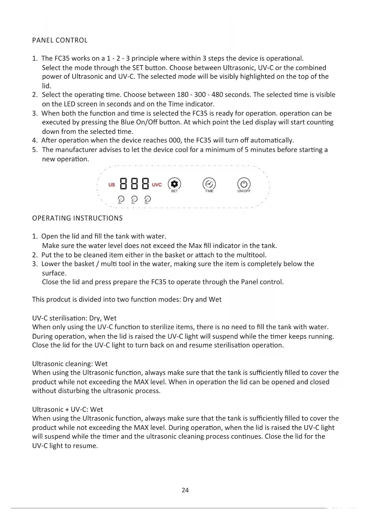 surface. Close the lid and press prepare the FC35 to operate through the Panel control. This prodcut is divided into two funcon modes: Dry and Wet UV-C sterilisaon: Dry, Wet When only using the UV-C funcon to sterilize items, there is no need to ll the tank with water. During operaon, when the lid is raised the UV-C light will suspend while the mer keeps running. Close the lid for the UV-C light to turn back on and resume sterilisaon operaon. Ultrasonic cleaning: Wet When using the Ultrasonic funcon, always make sure that the tank is suciently lled to cover the product while not exceeding the MAX level. When in operaon the lid can be opened and closed without disturbing the ultrasonic process. Ultrasonic + UV-C: Wet When using the Ultrasonic funcon, always make sure that the tank is suciently lled to cover the product while not exceeding the MAX level. During operaon, when the lid is raised the UV-C light will suspend while the mer and the ultrasonic cleaning process connues. Close the lid for the UV-C light to resume.25