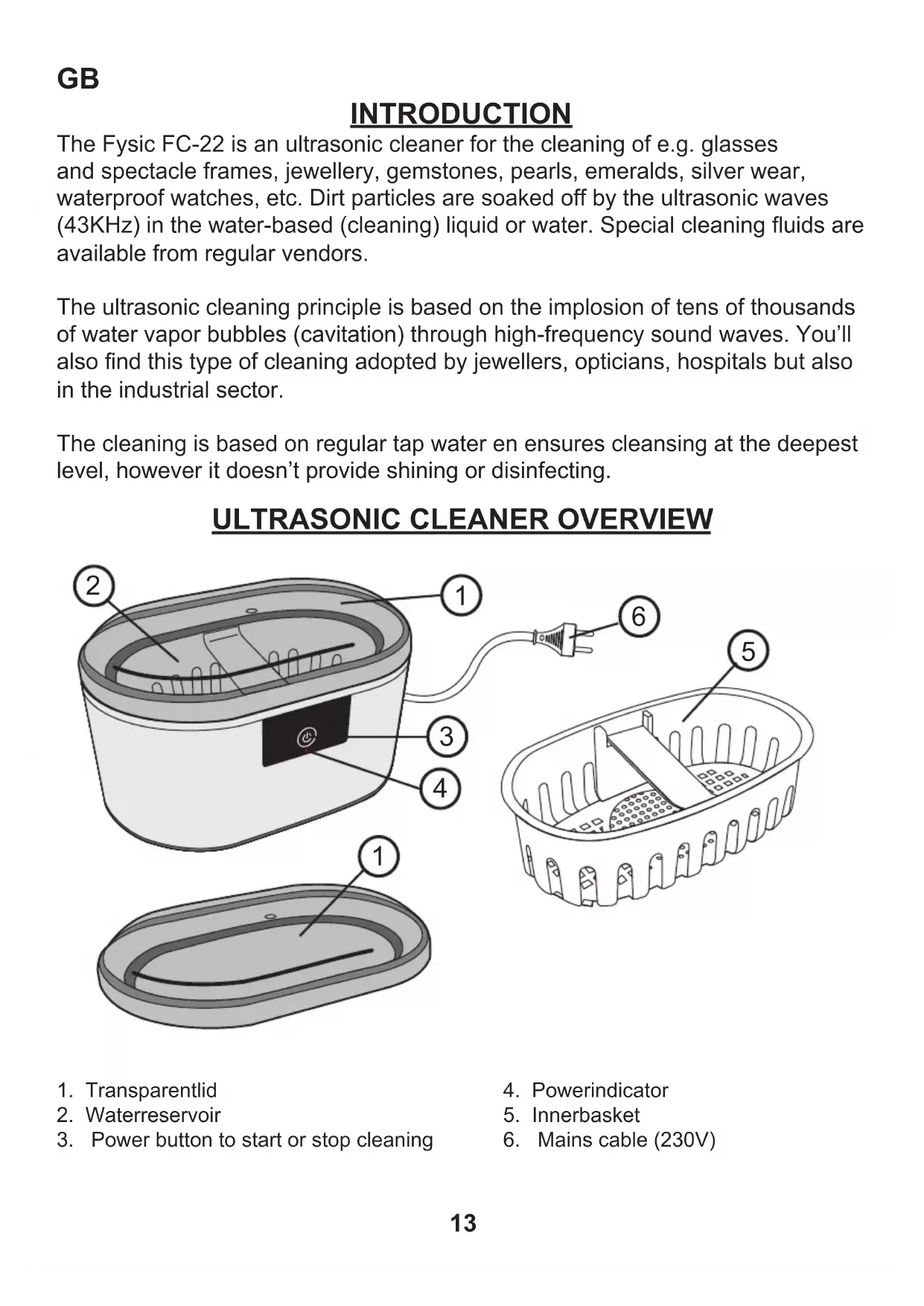 INTRODUCTION The Fysic FC-22 is an ultrasonic cleaner for the cleaning of e.g. glasses and spectacle frames, jewellery, gemstones, pearls, emeralds, silver wear, waterproof watches, etc. Dirt particles are soaked off by the ultrasonic waves (43KHz) in the water-based (cleaning) liquid or water. Special cleaning uids are available from regular vendors. The ultrasonic cleaning principle is based on the implosion of tens of thousands of water vapor bubbles (cavitation) through high-frequency sound waves. You’ll also nd this type of cleaning adopted by jewellers, opticians, hospitals but also in the industrial sector. The cleaning is based on regular tap water en ensures cleansing at the deepest level, however it doesn’t provide shining or disinfecting.