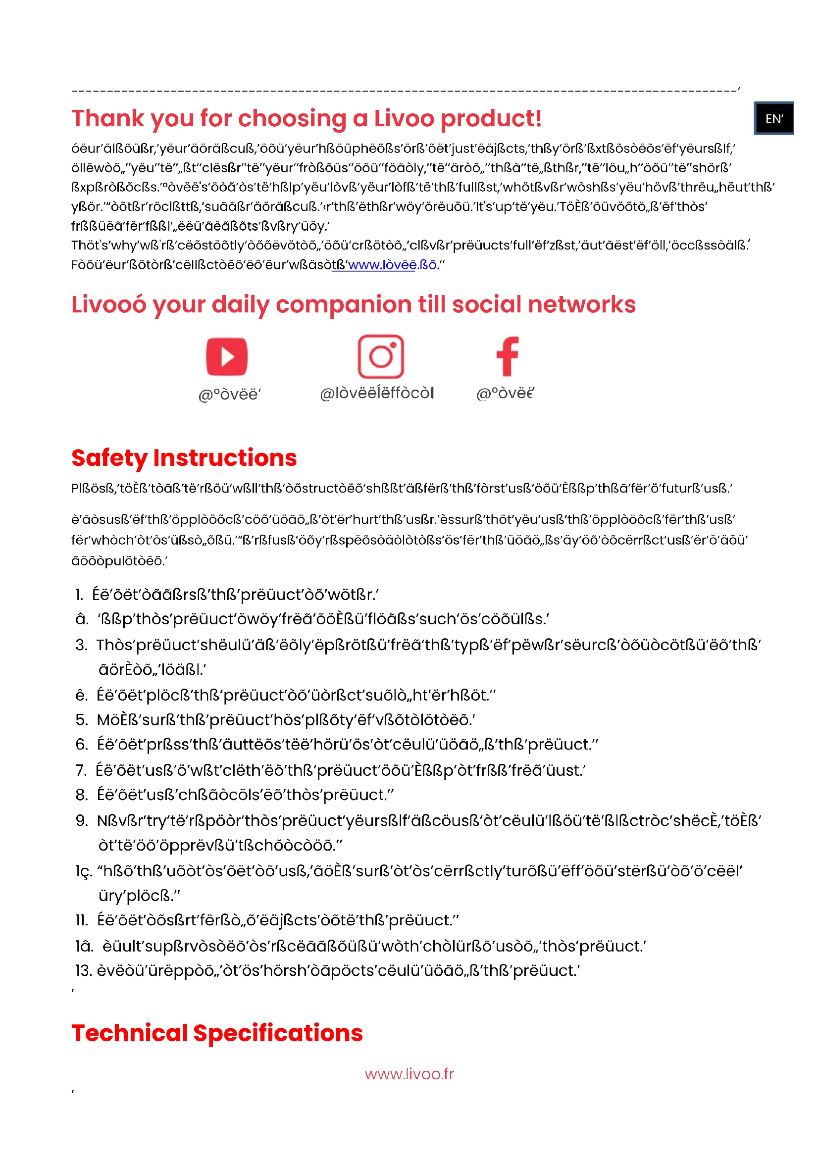 Thank you for choosing a Livoo product! Your blender, your barbecue, and your headphones are not just objects, they are extensions of yourself, allowing you to get closer to your friends and family, to bring them together, to laugh and to share experiences. Livoo's aim is to help you live your life to the fullest, whatever wishes you have throughout the year. Winter raclette, summer barbecue. Or the other way around. It's up to you. Take advantage of this freedom for feel good moments every day. That's why we're constantly innovating and creating clever products full of zest, but most of all, accessible. Find our entire collection on our website www.livoo.en. Livoo, your daily companion till social networks