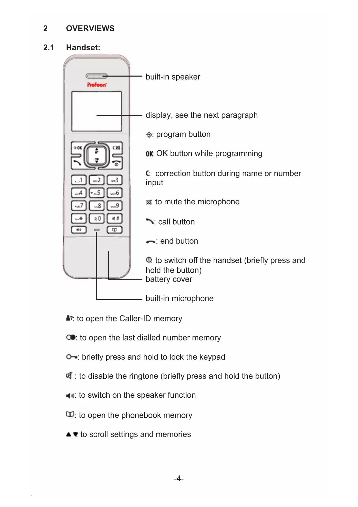 built-in speaker display, see the next paragraph : program button : OK button while programming : correction button during name or number input : to mute the microphone : call button : end button : to switch o the handset (briey press and hold the button) battery cover built-in microphone : to open the Caller-ID memory : to open the last dialled number memory : briey press and hold to lock the keypad : to disable the ringtone (briey press and hold the button) : to switch on the speaker function : to open the phonebook memory : to scroll settings and memories-5-