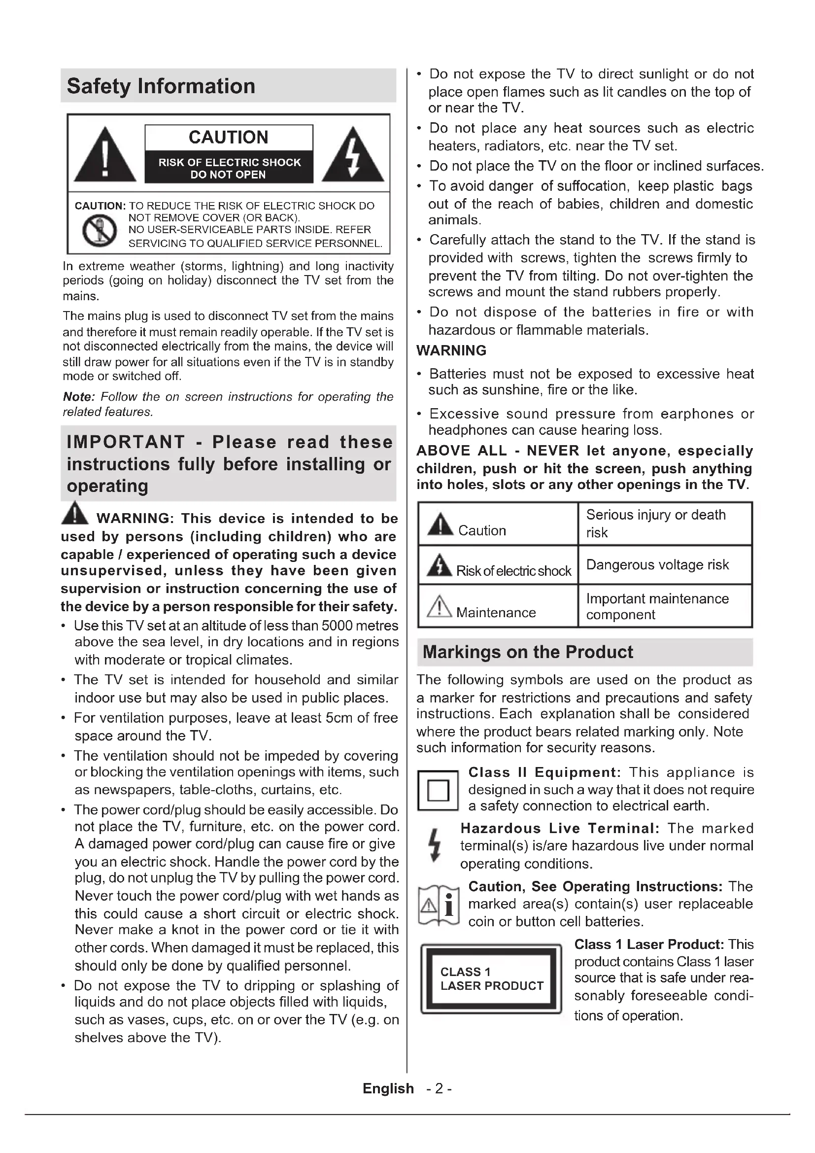 - Excessive sound pressure from earphones or headphones can cause hearing loss. ABOVE ALL - NEVER let anyone, especially children, push or hit the screen, push anything into holes, slots or any other openings in the TV. CautionSerious injury or death risk Risk of electric shockDangerous voltage risk MaintenanceImportant maintenance component Markings on the Product The following symbols are used on the product as a marker for restrictions and precautions and safety