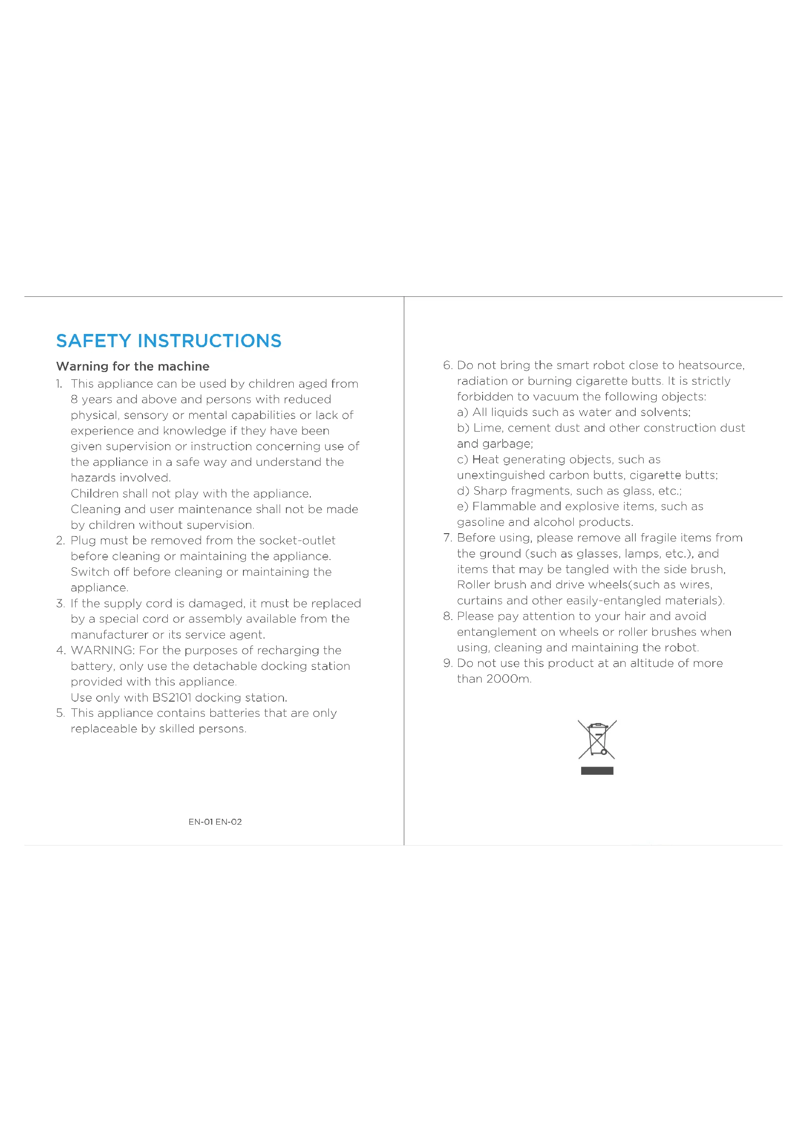 turn the robot’s bottom upwards, and grasp the side brush by its rubber-coating leg (take care not to pull on hair bundles of the side brush with brute force) with your two hands to pull it o. 2.EN-15 EN-16 Robot charging Before first use, put robot on the station closely, and make sure robot is in charging status for first use, then start robot. For future use, robot can automatically goes to the charging base when cleaning is finished. Instructions prior to use Prior to startup, clear away sundries on the floor, and remove easily falling, fragile, valuable, and possibly hazardous items.