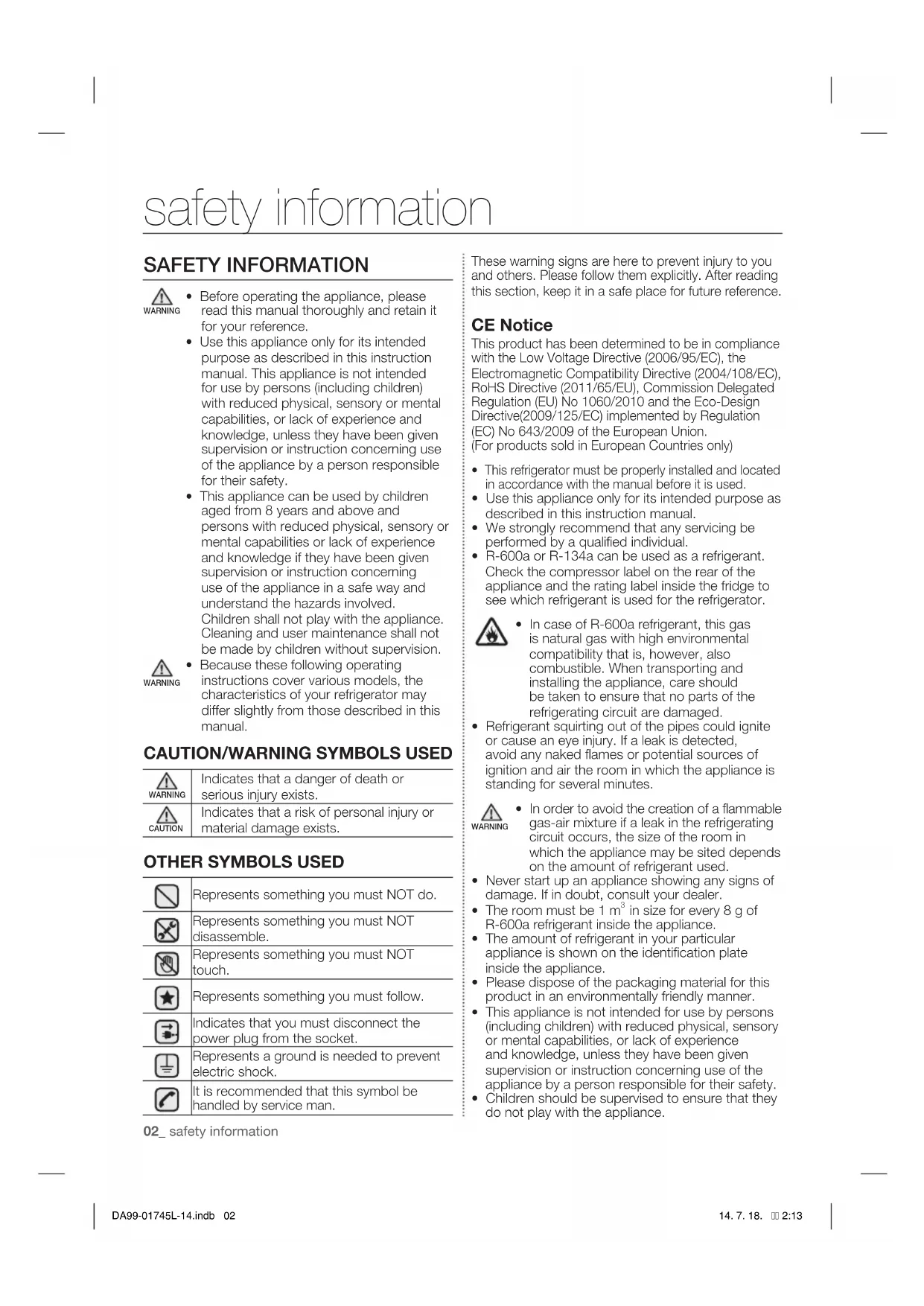 English Refrigerator user manual imagine the possibilities Thank you for purchasing a Samsung product. Free Standing Appliance This manual is made with 100% recycled paper. DA99-01745L-14.indb 01DA99-01745L-14.indb 01 14. 7. 18. 2:1314. 7. 18. 2:1302_ safety information SAFETY INFORMATION