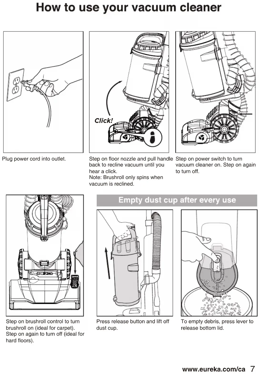 - This product can expose you to chemicals including Styrene, which is known to the State of California to cause cancer, and Bisphenol-A, which is known to the State of California to cause birth defects or other reproductive harm. For more information go to www.P65Warnings.ca.gov. this appliance has a polarized plug (one blade is wider than the other). !4 Eureka Customer Service HELPLINE 1-800-282-2886 What comes in the carton GUIDE Important safeguards Vacuum cleaner Crevice tool (NEU180-NEU187) Dusting brush Pet tool (NEU180-NEU187) Handle Hose5 Warp cord around upper and lower cord wraps. Store crevice tool on back and dusting brush on side of vacuum cleaner. Have hose go through the lower hose hook Have hose connector fix with dust cup in clockwise direction. Click! Slide handle into top of vacuum cleaner. Push down until it clicks. Push loose end of hose securely into hose inlet and twist clockwise to lock. Loop hose over upper hose hook. Vacuum cleaner with dust cup. Store turbo brush on front of handle. Align brush opening with slot and push to snap tool into clip. www.eureka.com/ca6 Eureka Customer Service HELPLINE 1-800-282-2886 Handle with wand Pet tool Dust cup release button Dust cup handle Dust cup latch Washable Filter screen Power switch Upper hose hook Hose Lower cord wrap Brushroll on/off switch Lower hose hook Vacuum cleaner Belt Brushroll Dust cup Upper cord wrap Cord clip Detachable handle hose connection Handle release latch Power cord Dust cup Post motor filter LED headlights7 Plug power cord into outlet. Step on brushroll control to turn brushroll on (ideal for carpet). Step on again to turn off (ideal for hard floors). Step on floor nozzle and pull handle back to recline vacuum until you hear a click. Note: Brushroll only spins when vacuum is reclined. Press release button and lift off dust cup. To empty debris, press lever to release bottom lid. Click! Step on power switch to turn vacuum cleaner on. Step on again to turn off. www.eureka.com/ca8 Eureka Customer Service HELPLINE 1-800-282-2886