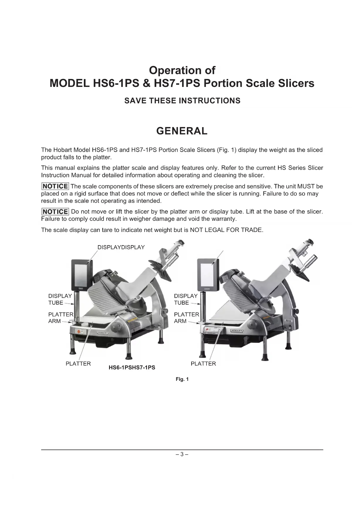 GENERAL The Hobart Model HS6-1PS and HS7-1PS Portion Scale Slicers (Fig. 1) display the weight as the sliced product falls to the platter. This manual explains the platter scale and display features only. Refer to the current HS Series Slicer Instruction Manual for detailed information about operating and cleaning the slicer. The scale components of these slicers are extremely precise and sensitive. The unit MUST be placed on a rigid surface that does not move or deect while the slicer is running. Failure to do so may result in the scale not operating as intended. Do not move or lift the slicer by the platter arm or display tube. Lift at the base of the slicer. Failure to comply could result in weigher damage and void the warranty. The scale display can tare to indicate net weight but is NOT LEGAL FOR TRADE. Fig. 1 HS6-1PS HS7-1PS DISPLAY DISPLAY PLATTER PLATTER ARM DISPLAY TUBE PLATTER ARM DISPLAY TUBE PLATTER– 4 – WARRANTY DISCLAIMER Installations and repairs carried out by non-authorized service technicians may aect the slicer warranty. Using other than original replacement parts may aect the slicer warranty. Technical alterations to the slicer may aect the slicer warranty. For warranty information, please contact Hobart Customer Care. GENERAL INFORMATION Hobart reserves the right to alter the design of its products without prior notice. If you have questions regarding slicer details not included in this manual, contact your local Hobart Service Oce. INSTALLATION UNPACKING The slicer was inspected before leaving the factory. The carrier assumes full responsibility for the safe delivery of the slicer upon acceptance of the slicer for shipping. The customer must check for possible shipping damage immediately upon receipt before moving, installing, or modifying the slicer. If damage is found, keep all original packaging materials for inspection purposes. The customer must complete the following steps to report the damage.