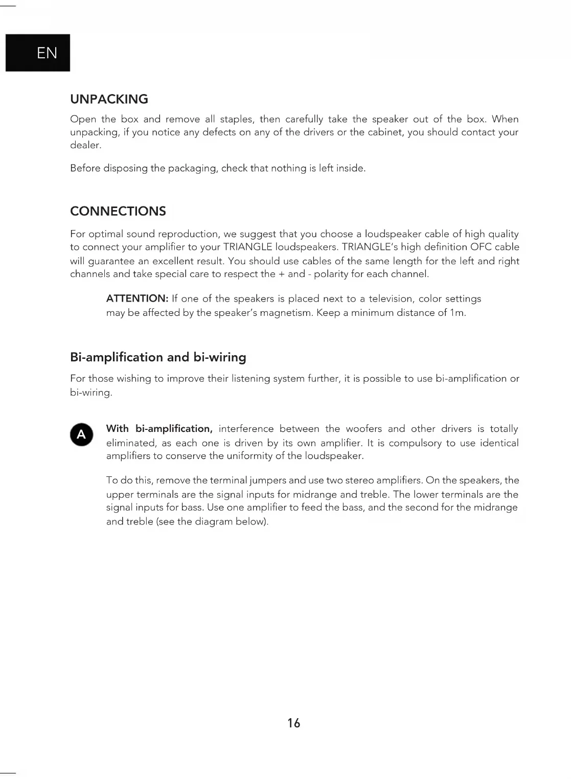 UNPACKING Open the box and remove all staples, then carefully take the speaker out of the box. When unpacking, if you notice any defects on any of the drivers or the cabinet, you should contact your dealer. Before disposing the packaging, check that nothing is left inside. CONNECTIONS For optimal sound reproduction, we suggest that you choose a loudspeaker cable of high quality to connect your amplier to your TRIANGLE loudspeakers. TRIANGLE’s high denition OFC cable will guarantee an excellent result. You should use cables of the same length for the left and right channels and take special care to respect the + and - polarity for each channel. ATTENTION: If one of the speakers is placed next to a television, color settings may be affected by the speaker’s magnetism. Keep a minimum distance of 1m. Bi-amplication and bi-wiring For those wishing to improve their listening system further, it is possible to use bi-amplication or bi-wiring. With bi-amplication, interference between the woofers and other drivers is totally eliminated, as each one is driven by its own amplier. It is compulsory to use identical ampliers to conserve the uniformity of the loudspeaker. To do this, remove the terminal jumpers and use two stereo ampliers. On the speakers, the upper terminals are the signal inputs for midrange and treble. The lower terminals are the signal inputs for bass. Use one amplier to feed the bass, and the second for the midrange and treble (see the diagram below). A17