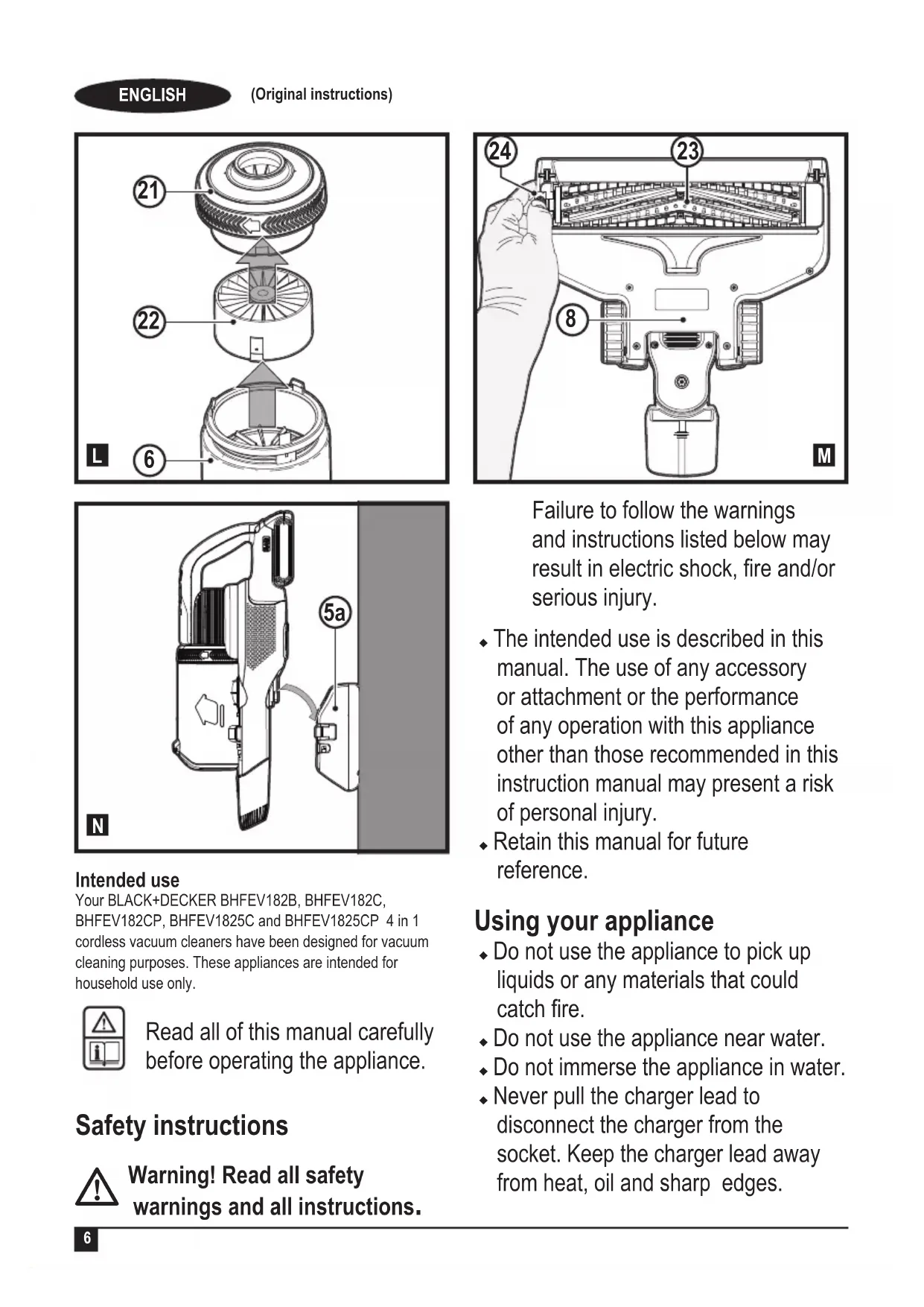 Intended use Your BLACK+DECKER BHFEV182B, BHFEV182C, BHFEV182CP, BHFEV1825C and BHFEV1825CP 4 in 1 cordless vacuum cleaners have been designed for vacuum cleaning purposes. These appliances are intended for household use only. Read all of this manual carefully before operating the appliance. Safety instructions