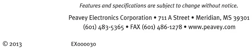 (2) Ship the defective item, prepaid, to Peavey Electronics Corporation, International Service Center, 412 Highway 11 & 80 East, Meridian, MS 39301. Include a detailed description of the problem, together with a copy of your sales receipt or other proof of date of purchase as evidence of Warranty coverage. Also provide a complete return address. Limitation of Implied Warranties ANY IMPLIED WARRANTIES, INCLUDING WARRANTIES OF MERCHANTABILITY AND FITNESS FOR A PARTICULAR PURPOSE, ARE LIMITED IN DURATION TO THE LENGTH OF THIS WARRANTY. Some states do not allow limitations on how long an implied Warranty lasts, so the above limitation may not apply to you. Exclusions of Damages PEAVEY’S LIABILITY FOR ANY DEFECTIVE PRODUCT IS LIMITED TO THE REPAIR OR REPLACEMENT OF THE PRODUCT, AT PEAVEY’S OPTION. IF WE ELECT TO REPLACE THE PRODUCT, THE REPLACEMENT MAY BE A RECONDITIONED UNIT. PEAVEY SHALL NOT BE LIABLE FOR DAMAGES BASED ON INCONVENIENCE, LOSS OF USE, LOST PROFITS, LOST SAVINGS, DAMAGE TO ANY OTHER EQUIPMENT OR OTHER ITEMS AT THE SITE OF USE, OR ANY OTHER DAMAGES WHETHER INCIDENTAL, CONSEQUENTIAL OR OTHERWISE, EVEN IF PEAVEY HAS BEEN ADVISED OF THE POSSIBILITY OF SUCH DAMAGES. Some states do not allow the exclusion or limitation of incidental or consequential damages, so the above limitation may not apply to you. This Warranty gives you specific legal rights, and you may also have other rights which vary from state to state. If you have any questions about this Warranty or services received or if you need assistance in locating an Authorized Service Center, please contact the Peavey International Service Center at (601) 483-5365. Features and specifications are subject to change without notice. Logo referenced in Directive 2002/96/EC Annex IV (OJ(L)37/38,13.02.03 and defined in EN 50419: 2005 The bar is the symbol for marking of new waste and is applied only to equipment manufactured after 13 August 2005U.S. CUSTOMER WARRANTY REGISTRATION Optional Product Extended Warranty Registration Give us some information and put your extended warranty into effect!