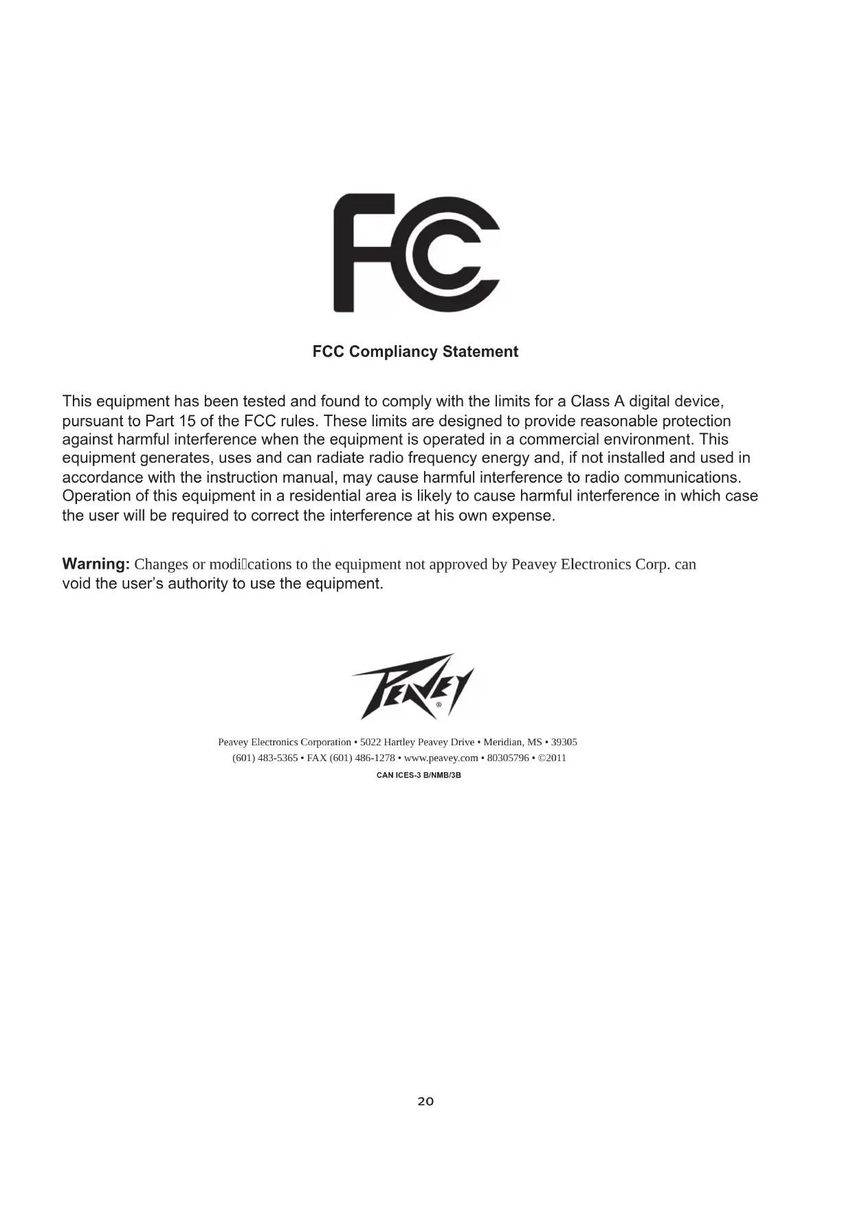 void the user’s authority to use the equipment. Peavey Electronics Corporation • 5022 Hartley Peavey Drive • Meridian, MS • 39305 (601) 483-5365 • FAX (601) 486-1278 • www.peavey.com • 80305796 • ©2011 FCC Compliancy Statement This device complies with Part 15 of the FCC rules. Operation is subject to the following two conditions: (1) this device may not cause harmful interference, and (2) this device must accept any interference received, that may cause undesired operation.