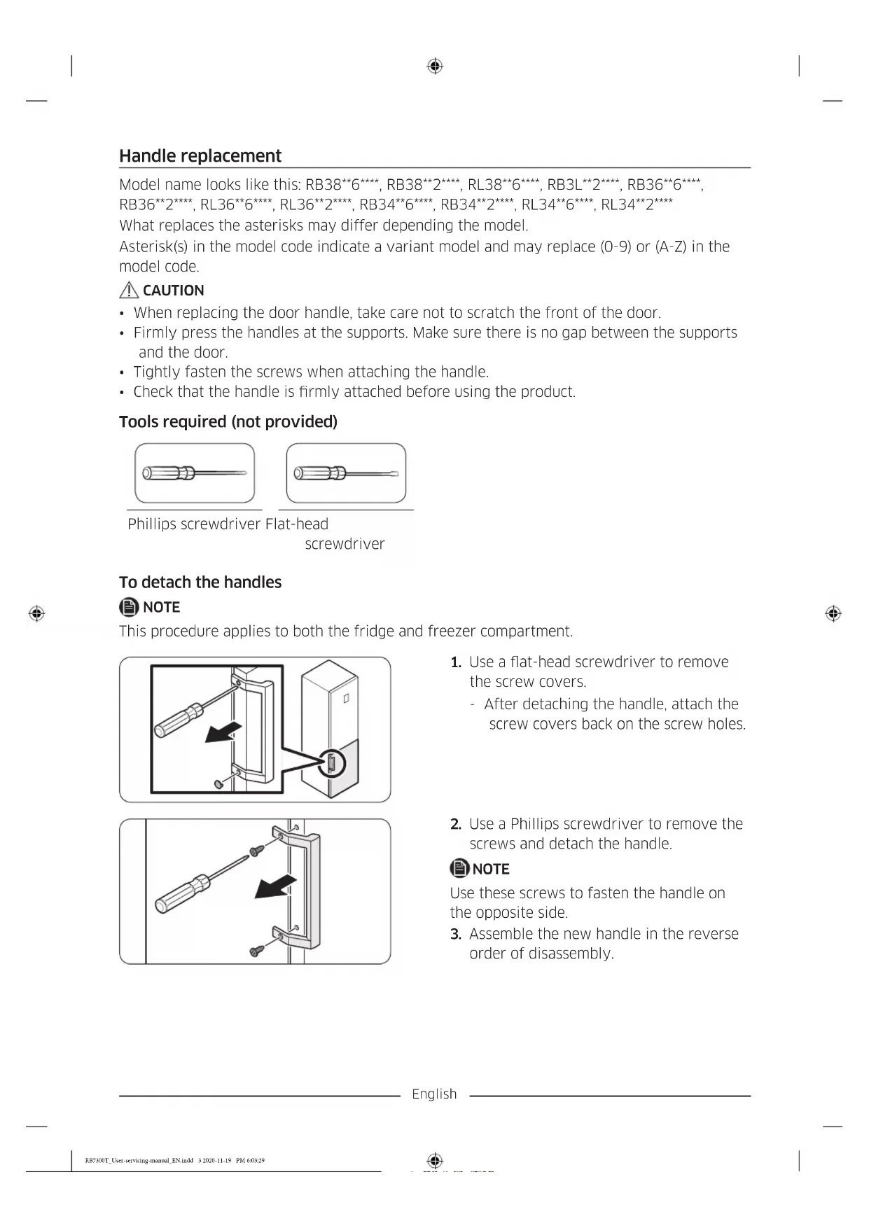 - Disconnect the power cord before reversing the doors. Tools required (not provided) Phillips screwdriver Flat-head screwdriver 11 mm spanner 10 mm socket wrench 8 mm socket wrench 10 mm spanner RB7300T_User-servicing-manual_EN.indd 5 2020-11-19 PM 6:03:31English Reversing the door NOTE For the models with handles, reverse the handles rst. (For detailed information, see the “Handle replacement (For models with bar handles)” section.)
