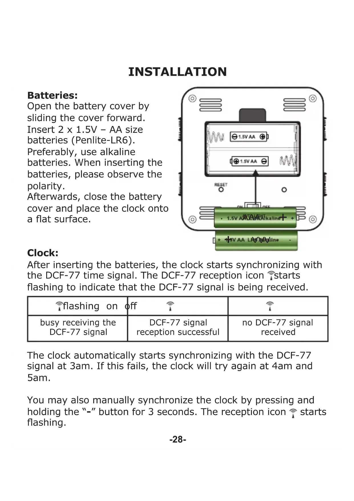 INSTALLATION Batteries: Open the battery cover by sliding the cover forward. Insert 2 x 1.5V – AA size batteries (Penlite-LR6). Preferably, use alkaline batteries. When inserting the batteries, please observe the polarity. Afterwards, close the battery cover and place the clock onto a at surface. Clock: After inserting the batteries, the clock starts synchronizing with the DCF-77 time signal. The DCF-77 reception icon starts ashing to indicate that the DCF-77 signal is being received. ashing on o busy receiving the DCF-77 signal DCF-77 signal reception successful no DCF-77 signal received The clock automatically starts synchronizing with the DCF-77 signal at 3am. If this fails, the clock will try again at 4am and 5am. You may also manually synchronize the clock by pressing and holding the “-” button for 3 seconds. The reception icon starts ashing. AUTO LIGHT AAA