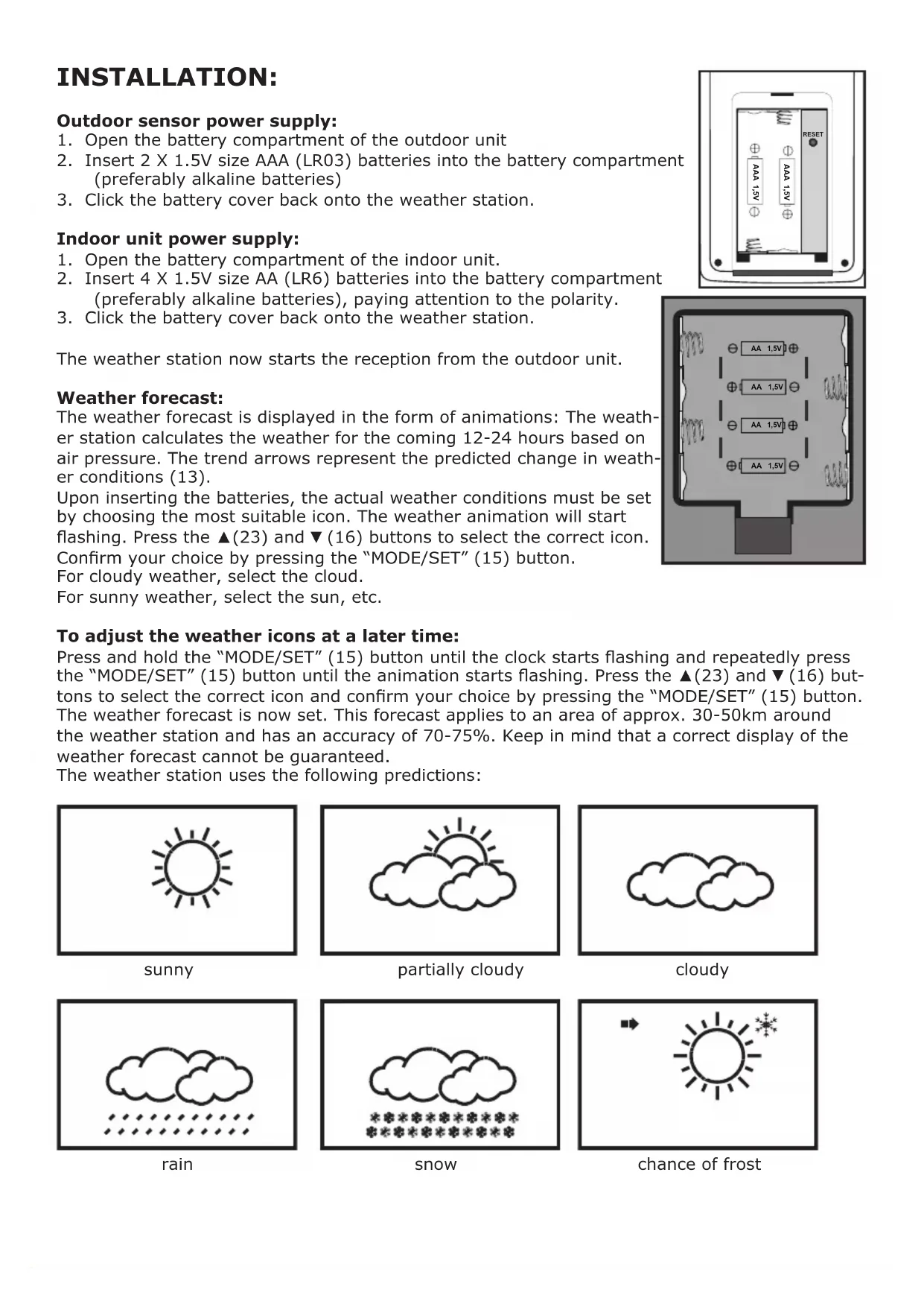 The weather station now starts the reception from the outdoor unit. Weather forecast: The weather forecast is displayed in the form of animations: The weath- er station calculates the weather for the coming 12-24 hours based on air pressure. The trend arrows represent the predicted change in weath- er conditions (13). Upon inserting the batteries, the actual weather conditions must be set by choosing the most suitable icon. The weather animation will start ashing. Press the ▲(23) and ▼(16) buttons to select the correct icon. Conrm your choice by pressing the “MODE/SET” (15) button. For cloudy weather, select the cloud. For sunny weather, select the sun, etc. To adjust the weather icons at a later time: Press and hold the “MODE/SET” (15) button until the clock starts ashing and repeatedly press the “MODE/SET” (15) button until the animation starts ashing. Press the ▲(23) and ▼(16) but- tons to select the correct icon and conrm your choice by pressing the “MODE/SET” (15) button. The weather forecast is now set. This forecast applies to an area of approx. 30-50km around the weather station and has an accuracy of 70-75%. Keep in mind that a correct display of the weather forecast cannot be guaranteed. The weather station uses the following predictions: sunny partially cloudy cloudy rain snow chance of frost AA 1,5V AA 1,5V AA 1,5V AA 1,5V ALARM MODE