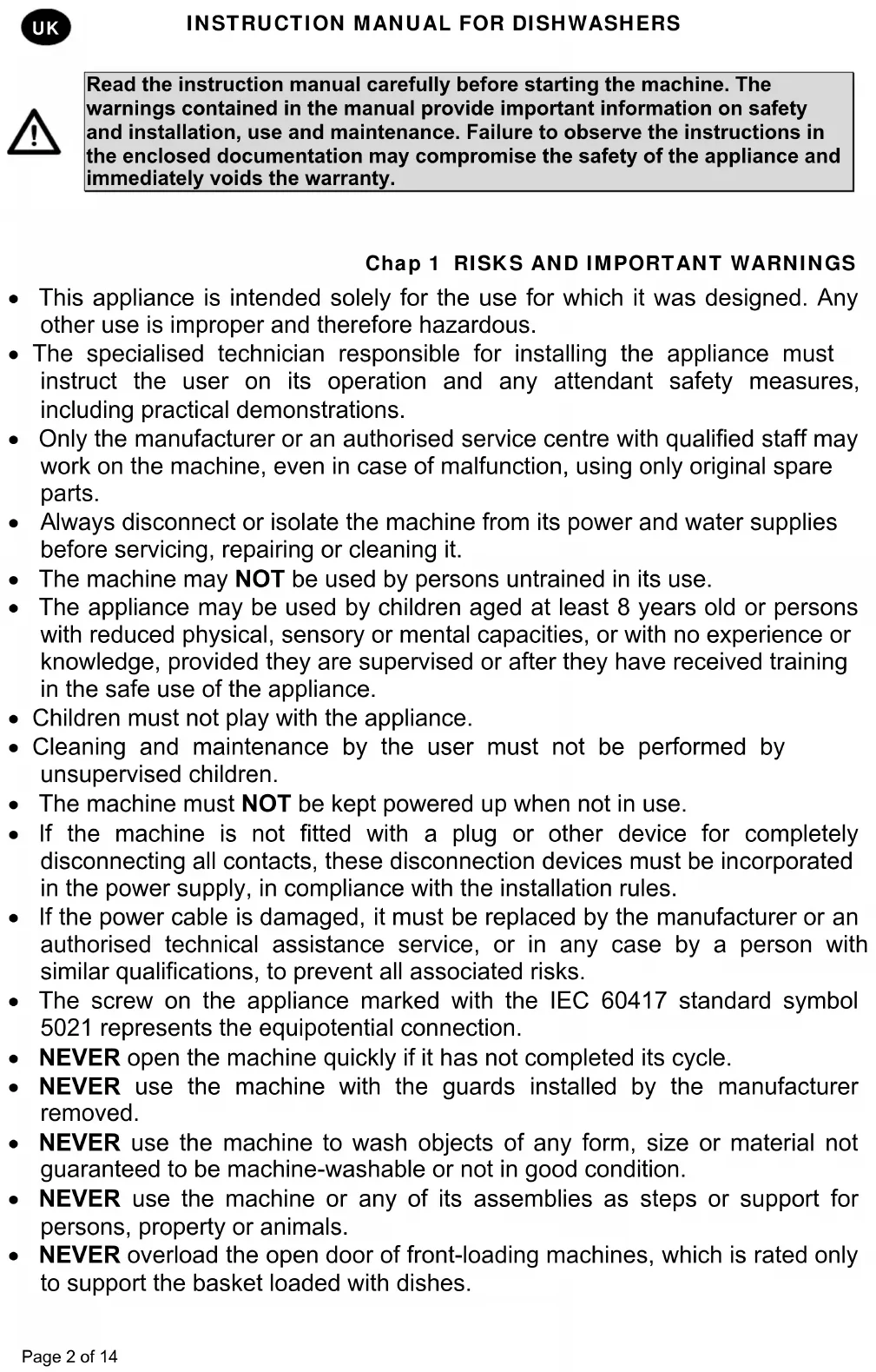 lways disconnect or isolate the machine from its power and water supplies before servicing, repairing or cleaning it. The machine may NOT be used by persons untrained in its use. The appliance may be used by children aged at least 8 years old or persons with reduced physical, sensory or mental capacities, or with no experience or knowledge, provided they are supervised or after they have received training in the safe use of the appliance. Children must not play with the appliance. Cleaning and maintenance by the user must not be performed by unsupervised children. The machine must NOT be kept powered up when not in use. If the machine is not fitted with a plug or other device for completely disconnecting all contacts, these disconnection devices must be incorporated in the power supply, in compliance with the installation rules. If the power cable is damaged, it must be replaced by the manufacturer or an authorised technical assistance service, or in any case by a person with similar qualifications, to prevent all associated risks. The screw on the appliance marked with the IEC 60417 standard symbol 5021 represents the equipotential connection. NEVER open the machine quickly if it has not completed its cycle. NEVER use the machine with the guards installed by the manufacturer removed. NEVER use the machine to wash objects of any form, size or material not guaranteed to be machine-washable or not in good condition. NEVER use the machine or any of its assemblies as steps or support for persons, property or animals. NEVER overload the open door of front-loading machines, which is rated only to support the basket loaded with dishes.INSTRUCTION MANUAL FOR DISHWASHERS Page 3 of 14