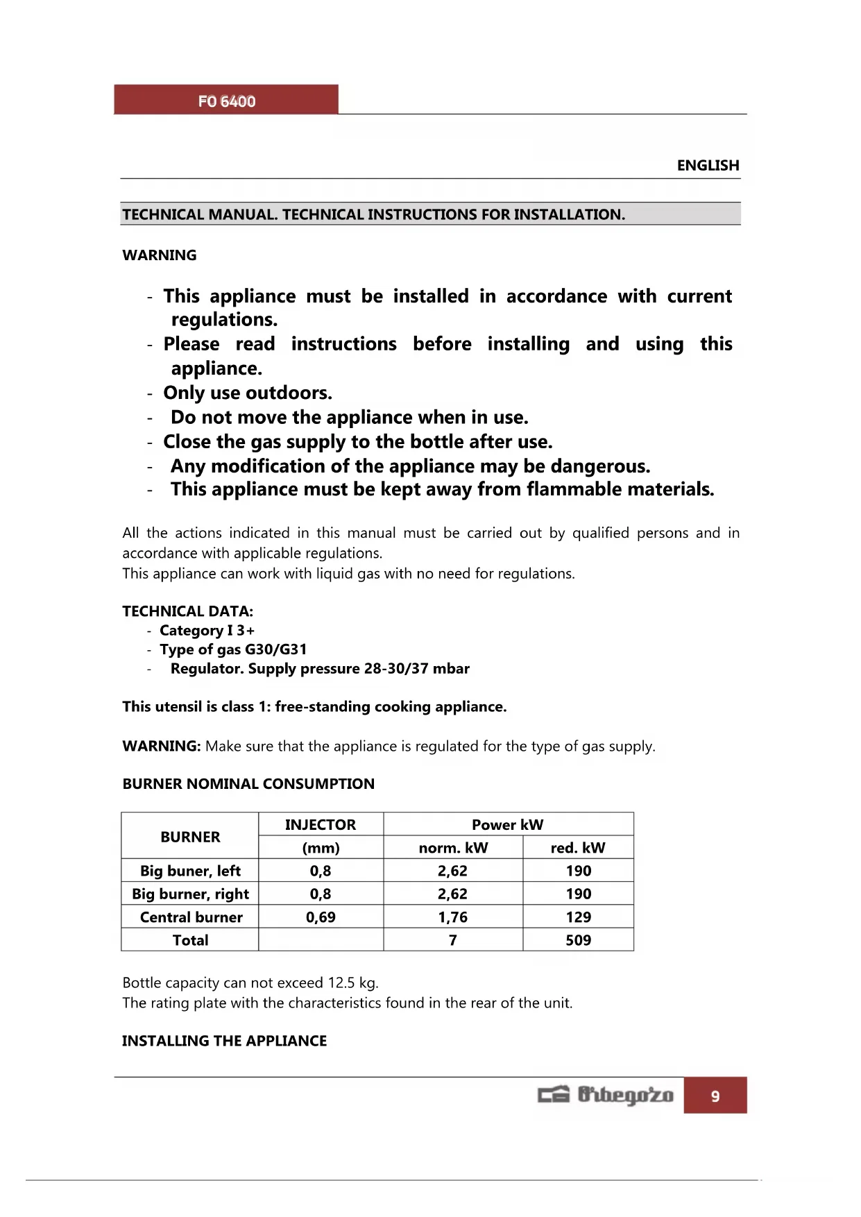 ENGLISH TECHNICAL MANUAL. TECHNICAL INSTRUCTIONS FOR INSTALLATION. WARNING - This appliance must be installed in accordance with current regulations. - Please read instructions before installing and using this appliance. - Only use outdoors. - Do not move the appliance when in use. - Close the gas supply to the bottle after use. - Any modification of the appliance may be dangerous. - This appliance must be kept away from flammable materials. All the actions indicated in this manual must be carried out by qualified persons and in accordance with applicable regulations. This appliance can work with liquid gas with no need for regulations. TECHNICAL DATA: - Category I 3+ - Type of gas G30/G31 - Regulator. Supply pressure 28-30/37 mbar This utensil is class 1: free-standing cooking appliance.