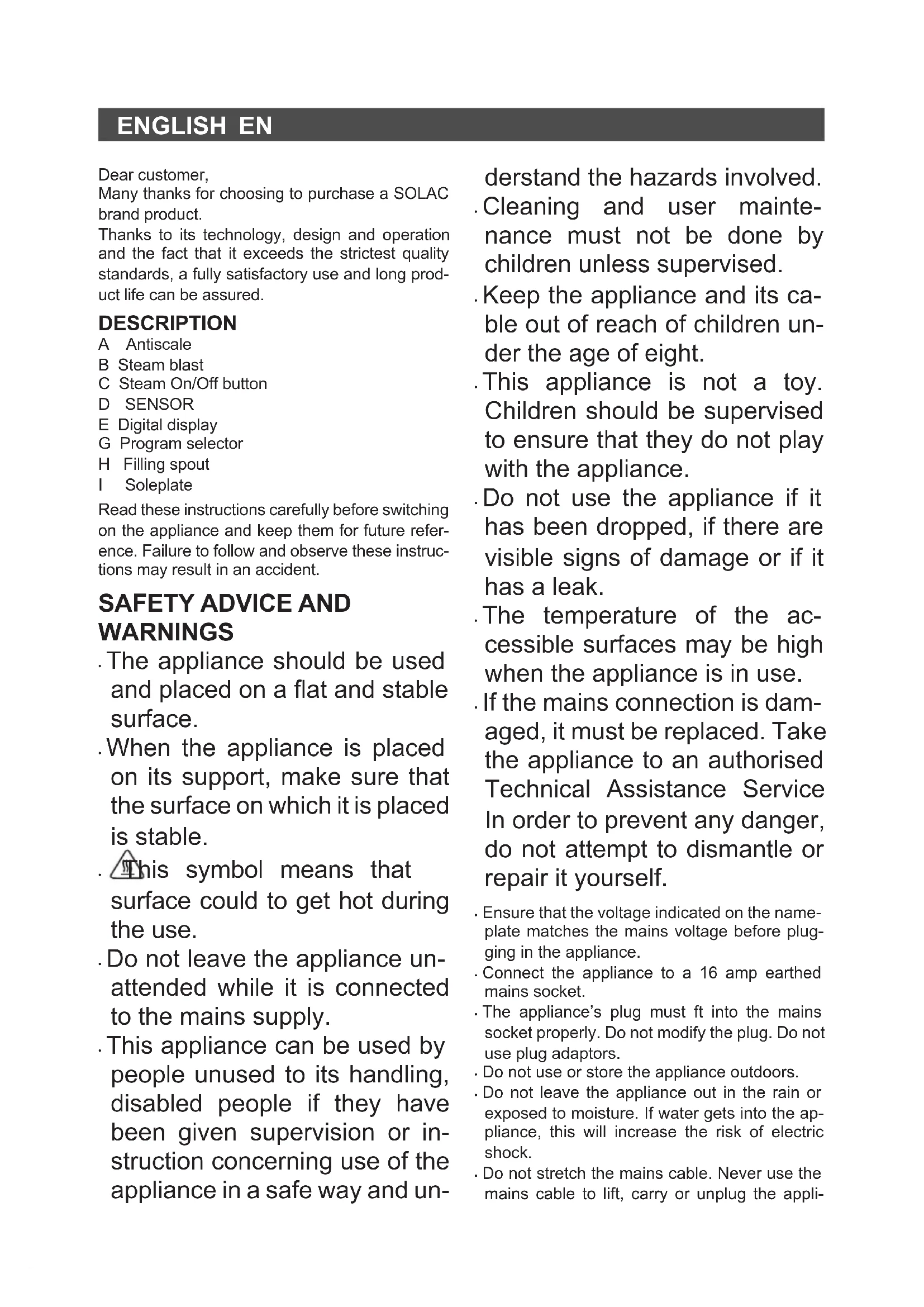 MOD. CVG9611 / 9612 / 9613 Solac is a registered Trade Mark