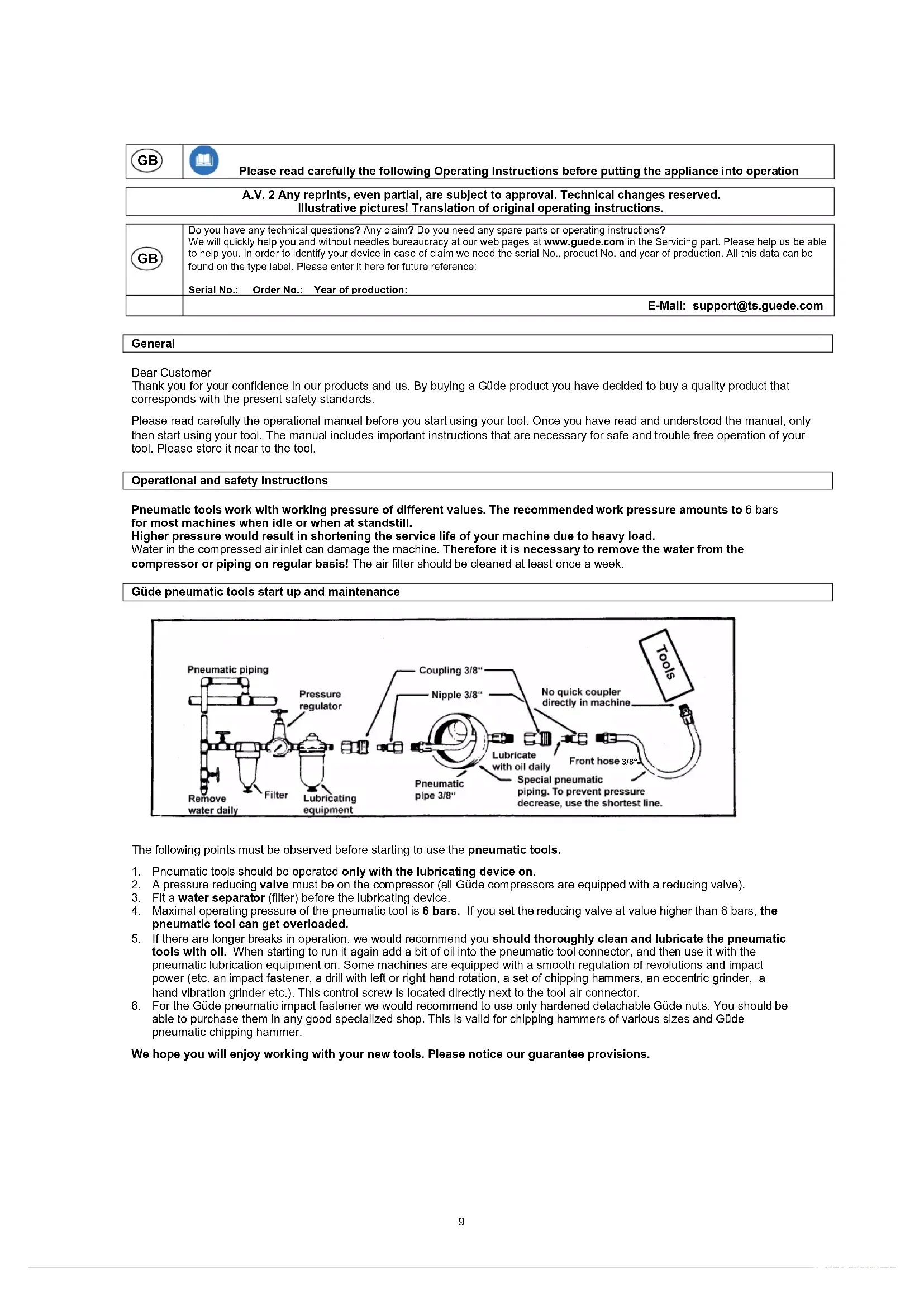 Do you have any technical questions? Any claim? Do you need any spare parts or operating instructions? We will quickly help you and without needles bureaucracy at our web pages at www.guede.com in the Servicing part. Please help us be able to help you. In order to identify your device in case of claim we need the serial No., product No. and year of production. All this data can be found on the type label. Please enter it here for future reference: Serial No.: Order No.: Year of production: E-Mail: support@ts.guede.com General Dear Customer Thank you for your confidence in our products and us. By buying a Güde product you have decided to buy a quality product that corresponds with the present safety standards. Please read carefully the operational manual before you start using your tool. Once you have read and understood the manual, only then start using your tool. The manual includes important instructions that are necessary for safe and trouble free operation of your tool. Please store it near to the tool. Operational and safety instructions Pneumatic tools work with working pressure of different values. The recommended work pressure amounts to 6 bars for most machines when idle or when at standstill. Higher pressure would result in shortening the service life of your machine due to heavy load. Water in the compressed air inlet can damage the machine. Therefore it is necessary to remove the water from the compressor or piping on regular basis! The air filter should be cleaned at least once a week. Güde pneumatic tools start up and maintenance The following points must be observed before starting to use the pneumatic tools.