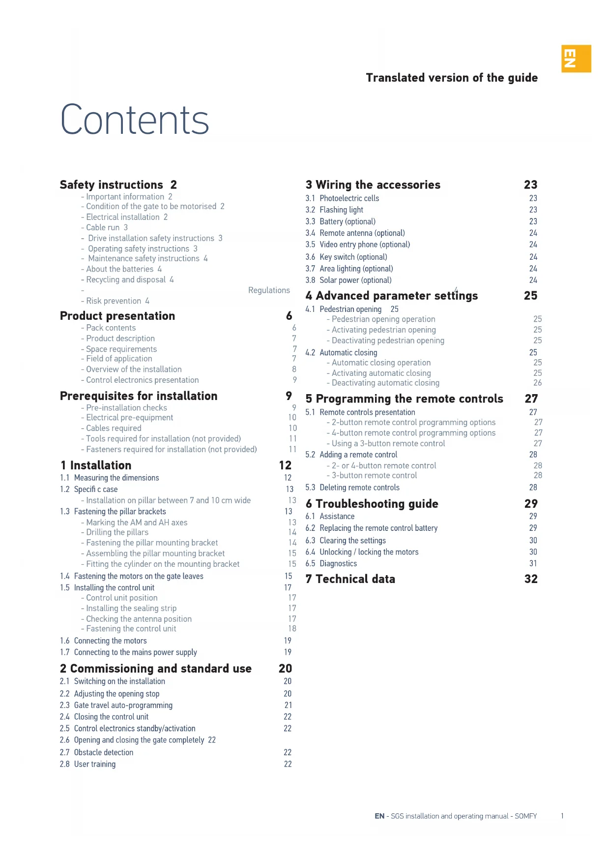 Translated version of the guide Contents Safety instructions 2 - Important information 2 - Condition of the gate to be motorised 2 - Electrical installation 2 - Cable run 3 - Drive installation safety instructions 3 - Operating safety instructions 3 - Maintenance safety instructions 4 - About the batteries 4 - Recycling and disposal 4 - Regulations 4 - Risk prevention 4 Product presentation 6 - Pack contents 6 - Product description 7 - Space requirements 7 - Field of application 7 - Overview of the installation 8 - Control electronics presentation 9 Prerequisites for installation 9 - Pre-installation checks 9 - Electrical pre-equipment 10 - Cables required 10 - Tools required for installation (not provided) 11 - Fasteners required for installation (not provided) 11 1 Installation 12