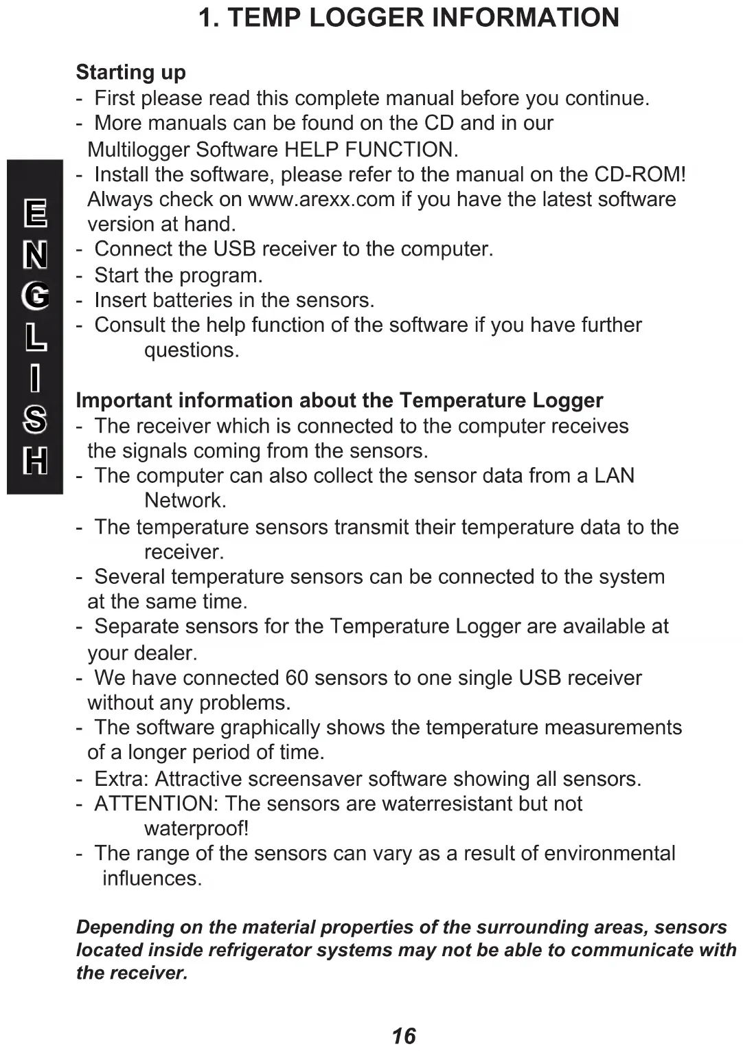 Starting up - First please read this complete manual before you continue. - More manuals can be found on the CD and in our Multilogger Software HELP FUNCTION. - Install the software, please refer to the manual on the CD-ROM! Always check on www.arexx.com if you have the latest software version at hand. - Connect the USB receiver to the computer. - Start the program. - Insert batteries in the sensors. - Consult the help function of the software if you have further questions. Important information about the Temperature Logger - The receiver which is connected to the computer receives the signals coming from the sensors. - The computer can also collect the sensor data from a LAN Network. - The temperature sensors transmit their temperature data to the receiver. - Several temperature sensors can be connected to the system at the same time. - Separate sensors for the Temperature Logger are available at your dealer. - We have connected 60 sensors to one single USB receiver without any problems. - The software graphically shows the temperature measurements of a longer period of time. - Extra: Attractive screensaver software showing all sensors. - ATTENTION: The sensors are waterresistant but not waterproof! - The range of the sensors can vary as a result of environmental inuences. Depending on the material properties of the surrounding areas, sensors located inside refrigerator systems may not be able to communicate with the receiver.