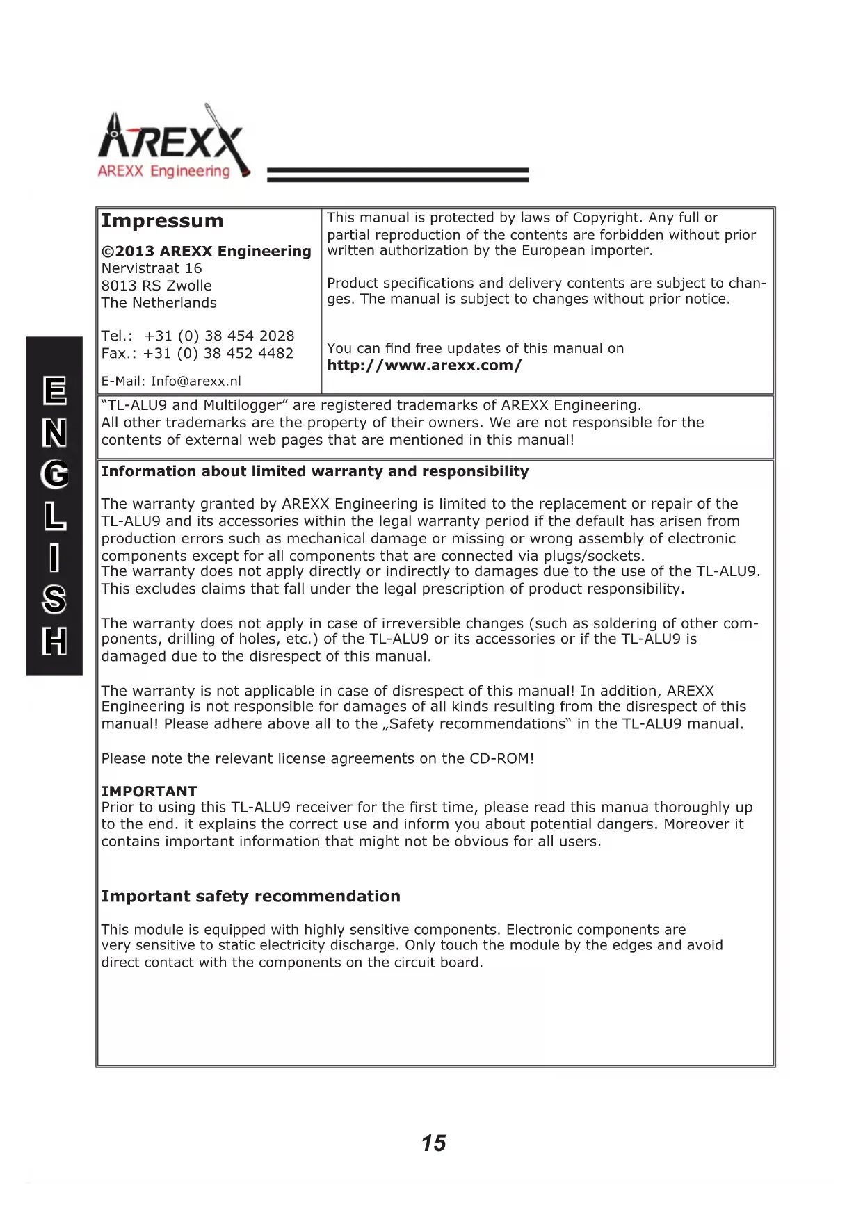 H15 Impressum ©2013 AREXX Engineering Nervistraat 16 8013 RS Zwolle The Netherlands Tel.: +31 (0) 38 454 2028 Fax.: +31 (0) 38 452 4482 E-Mail: Info@arexx.nlThis manual is protected by laws of Copyright. Any full or partial reproduction of the contents are forbidden without prior written authorization by the European importer.Product specications and delivery contents are subject to chan-ges. The manual is subject to changes without prior notice. You can nd free updates of this manual on http://www.arexx.com/ “TL-ALU9 and Multilogger” are registered trademarks of AREXX Engineering. All other trademarks are the property of their owners. We are not responsible for the contents of external web pages that are mentioned in this manual! Information about limited warranty and responsibility The warranty granted by AREXX Engineering is limited to the replacement or repair of the TL-ALU9 and its accessories within the legal warranty period if the default has arisen from production errors such as mechanical damage or missing or wrong assembly of electronic components except for all components that are connected via plugs/sockets. The warranty does not apply directly or indirectly to damages due to the use of the TL-ALU9. This excludes claims that fall under the legal prescription of product responsibility. The warranty does not apply in case of irreversible changes (such as soldering of other com- ponents, drilling of holes, etc.) of the TL-ALU9 or its accessories or if the TL-ALU9 is damaged due to the disrespect of this manual. The warranty is not applicable in case of disrespect of this manual! In addition, AREXX Engineering is not responsible for damages of all kinds resulting from the disrespect of this manual! Please adhere above all to the „Safety recommendations“ in the TL-ALU9 manual. Please note the relevant license agreements on the CD-ROM! IMPORTANT Prior to using this TL-ALU9 receiver for the rst time, please read this manua thoroughly up to the end. it explains the correct use and inform you about potential dangers. Moreover it contains important information that might not be obvious for all users. Important safety recommendation This module is equipped with highly sensitive components. Electronic components are very sensitive to static electricity discharge. Only touch the module by the edges and avoid direct contact with the components on the circuit board.