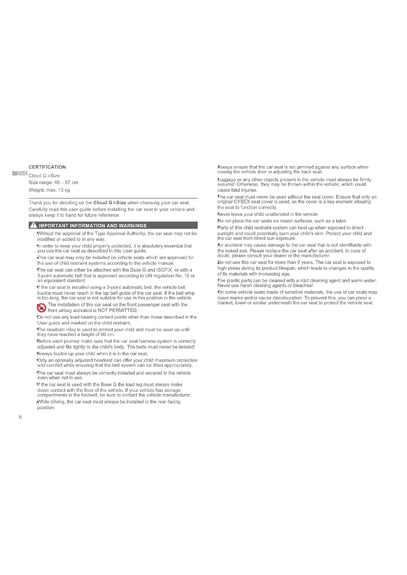 CERTIFICATION Cloud G i-Size Size range: 40 – 87 cm Weight: max. 13 kg Thank you for deciding on the Cloud G i-Size when choosing your car seat. Carefully read this user guide before installing the car seat in your vehicle and always keep it to hand for future reference.