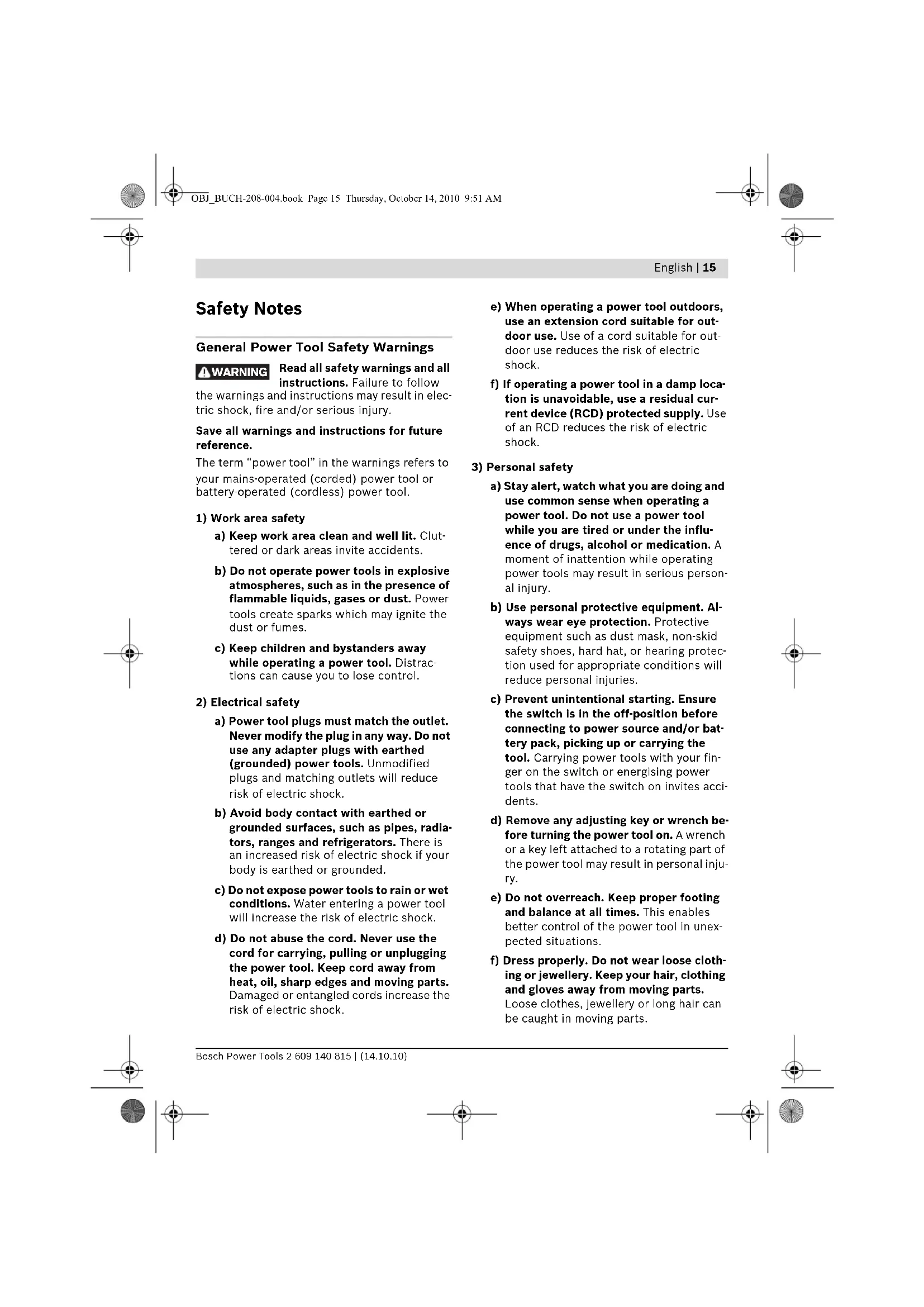 a) Stay alert, watch what you are doing and use common sense when operating a power tool. Do not use a power tool while you are tired or under the influ- ence of drugs, alcohol or medication. A moment of inattention while operating power tools may result in serious person- al injury. b) Use personal protective equipment. Al- ways wear eye protection. Protective equipment such as dust mask, non-skid safety shoes, hard hat, or hearing protec- tion used for appropriate conditions will reduce personal injuries. c) Prevent unintentional starting. Ensure the switch is in the off-position before connecting to power source and/or bat- tery pack, picking up or carrying the tool. Carrying power tools with your fin- ger on the switch or energising power tools that have the switch on invites acci- dents. d) Remove any adjusting key or wrench be- fore turning the power tool on. A wrench or a key left attached to a rotating part of the power tool may result in personal inju- ry. e) Do not overreach. Keep proper footing and balance at all times. This enables better control of the power tool in unex- pected situations. f) Dress properly. Do not wear loose cloth- ing or jewellery. Keep your hair, clothing and gloves away from moving parts. Loose clothes, jewellery or long hair can be caught in moving parts. WARNING OBJ_BUCH-208-004.book Page 15 Thursday, October 14, 2010 9:51 AM16 | English 2 609 140 815 | (14.10.10) Bosch Power Tools g) If devices are provided for the connec- tion of dust extraction and collection fa- cilities, ensure these are connected and properly used. Use of dust collection can reduce dust-related hazards.