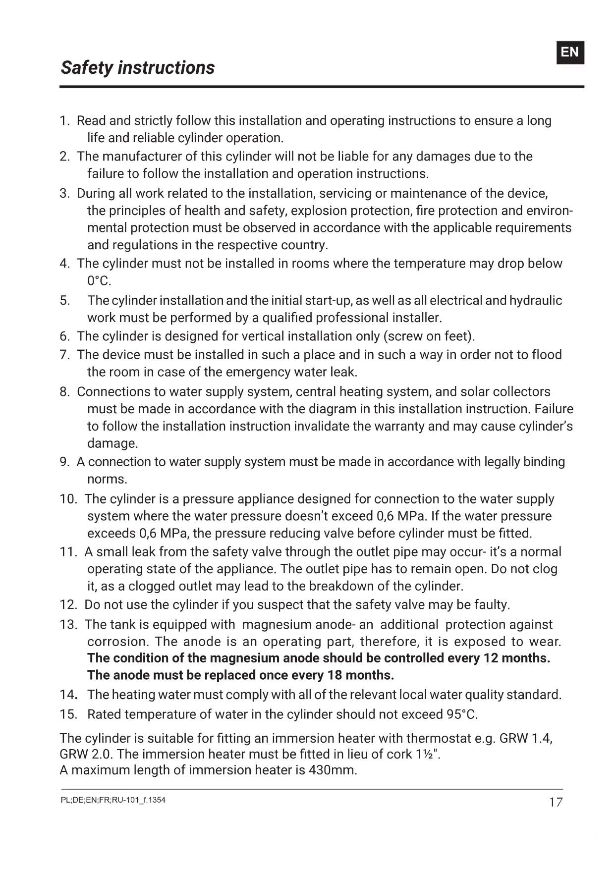 - Insulate the outlet pipe and heating coil connection pipes to minimise the heat loss (recommended). Above activities are beyond of the scope of warranty service (should be done by the user). How to deal with damage or irregularities Irregularity Instructions for conduct Water leakage from the tank turn off the cold water supply valve and the CH system cut-off valves and contact the service Excessive pressure build-up in the tank Pressure increase in the CH system Dirty water in the device The tank should be cleaned of accumulated sediments - for this purpose, contact a specialized service companyPL;DE;EN;FR;RU-101_f.1354