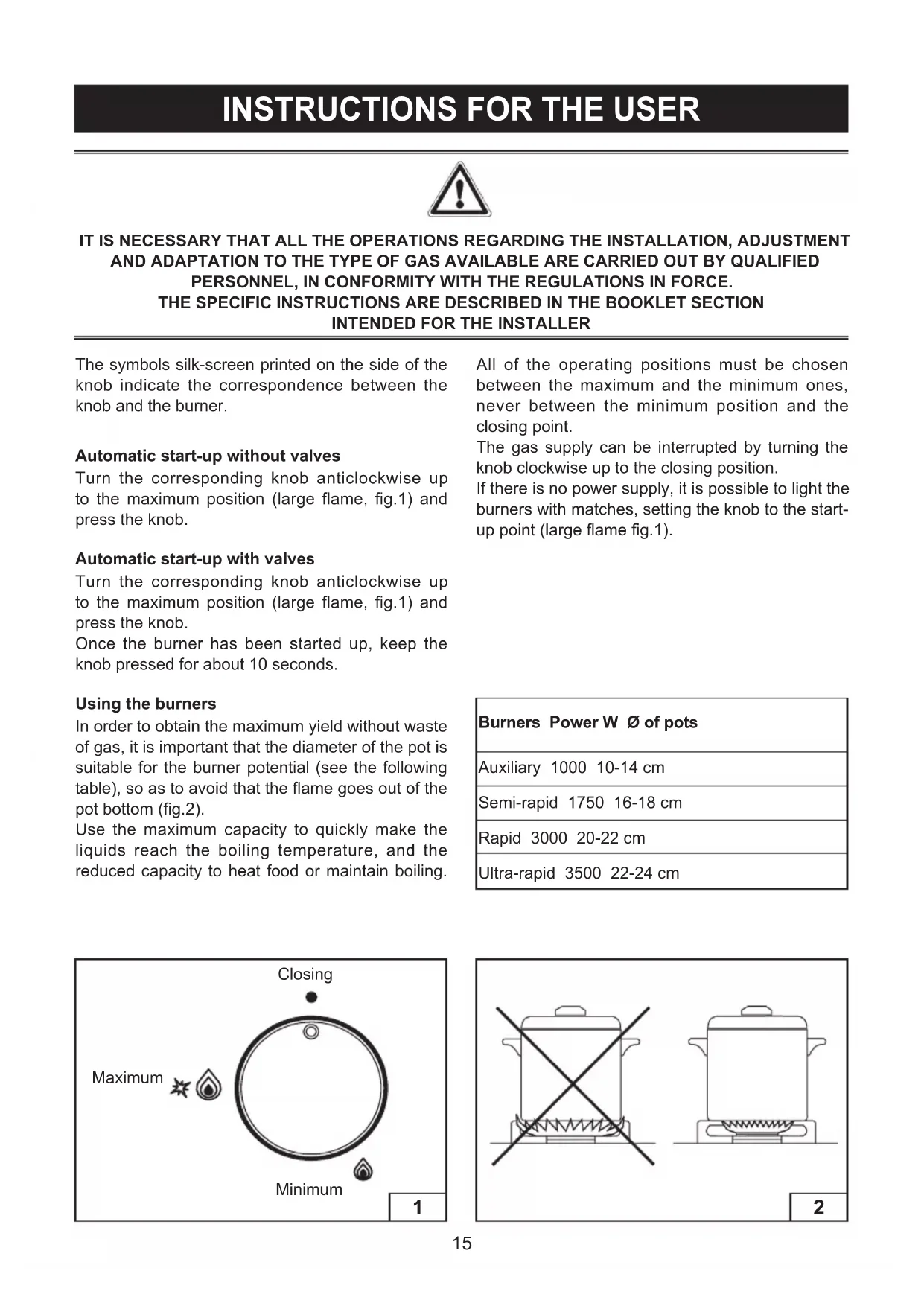 The symbols silk-screen printed on the side of the knob indicate the correspondence between the knob and the burner. Automatic start-up without valves Turn the corresponding knob anticlockwise up to the maximum position (large flame, fig.1) and press the knob. Automatic start-up with valves Turn the corresponding knob anticlockwise up to the maximum position (large flame, fig.1) and press the knob. Once the burner has been started up, keep the knob pressed for about 10 seconds. Using the burners In order to obtain the maximum yield without waste of gas, it is important that the diameter of the pot is suitable for the burner potential (see the following table), so as to avoid that the flame goes out of the pot bottom (fig.2). Use the maximum capacity to quickly make the liquids reach the boiling temperature, and the reduced capacity to heat food or maintain boiling. All of the operating positions must be chosen between the maximum and the minimum ones, never between the minimum position and the closing point. The gas supply can be interrupted by turning the knob clockwise up to the closing position. If there is no power supply, it is possible to light the burners with matches, setting the knob to the start- up point (large flame fig.1). Burners Power W Ø of pots Auxiliary 1000 10-14 cm Semi-rapid 1750 16-18 cm Rapid 3000 20-22 cm Ultra-rapid 3500 22-24 cm16