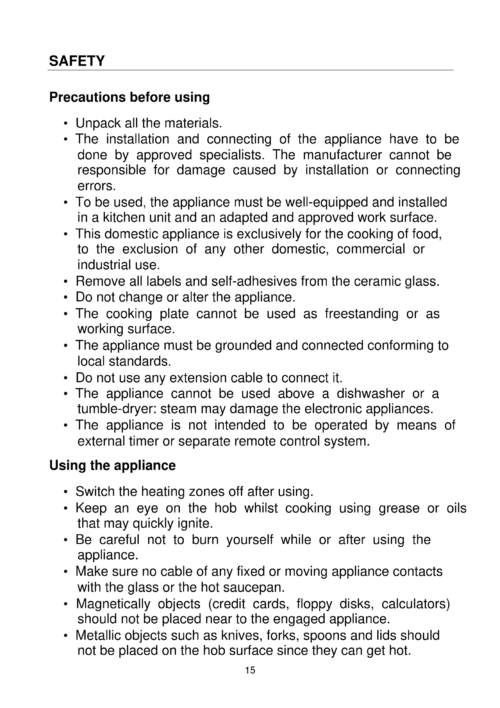 - Sugar, synthetic materials or aluminium sheets must not contact with the heating zones. These may cause breaks or other alterations of the vitroceramic glass by cooling: switch on the appliance and take them immediately out of the hot heating zone (be careful: do not burn yourself).