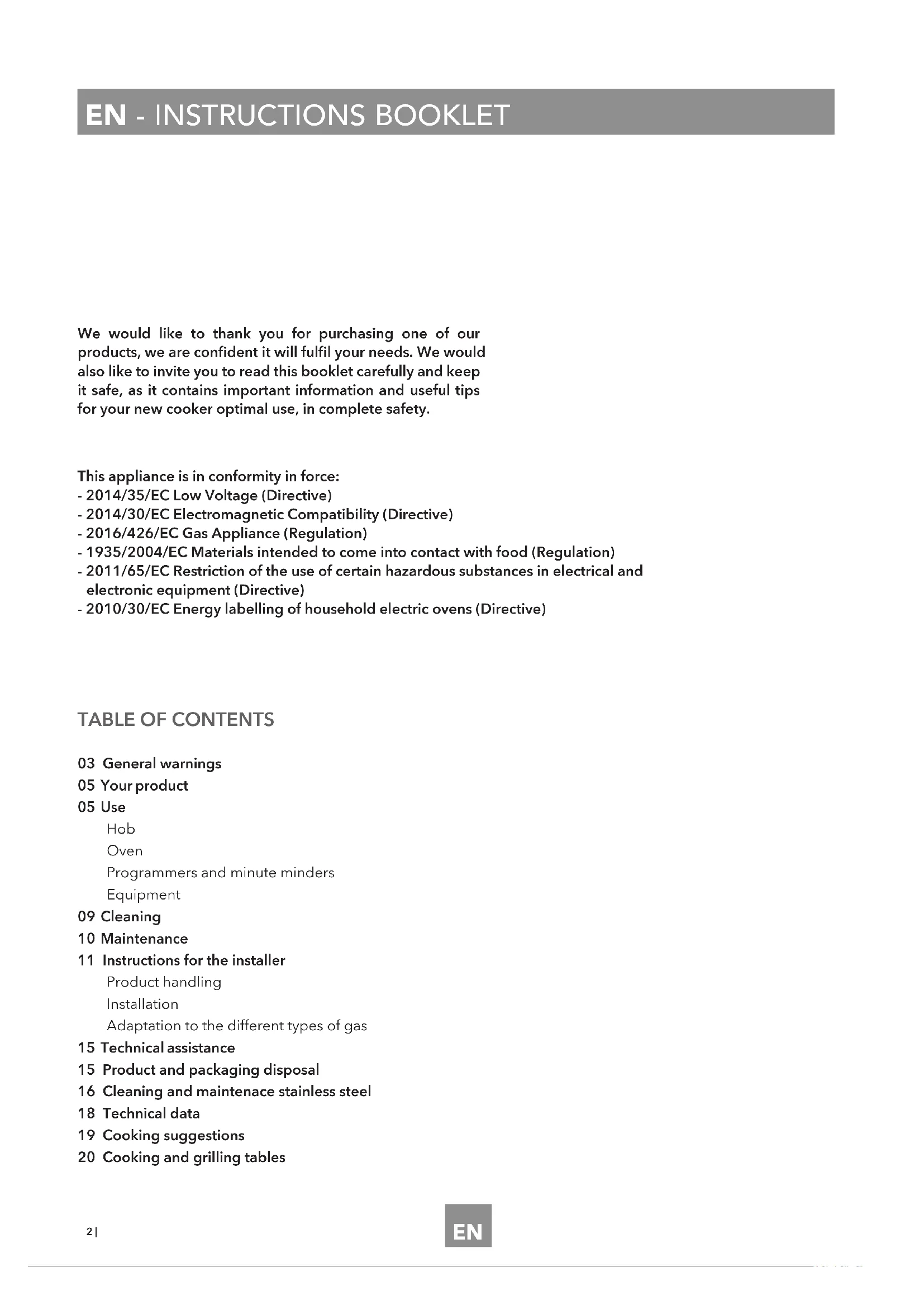 03 General warnings 05 Your product 05 Use Hob Oven Programmers and minute minders Equipment 09 Cleaning 10 Maintenance 11 Instructions for the installer Product handling Installation Adaptation to the different types of gas 15 Technical assistance 15 Product and packaging disposal 16 Cleaning and maintenace stainless steel 18 Technical data 19 Cooking suggestions 20 Cooking and grilling tables We would like to thank you for purchasing one of our products, we are condent it will full your needs. We would also like to invite you to read this booklet carefully and keep it safe, as it contains important information and useful tips for your new cooker optimal use, in complete safety. This appliance is in conformity in force: - 2014/35/EC Low Voltage (Directive) - 2014/30/EC Electromagnetic Compatibility (Directive) - 2016/426/EC Gas Appliance (Regulation) - 1935/2004/EC Materials intended to come into contact with food (Regulation) - 2011/65/EC Restriction of the use of certain hazardous substances in electrical and electronic equipment (Directive) - 2010/30/EC Energy labelling of household electric ovens (Directive)