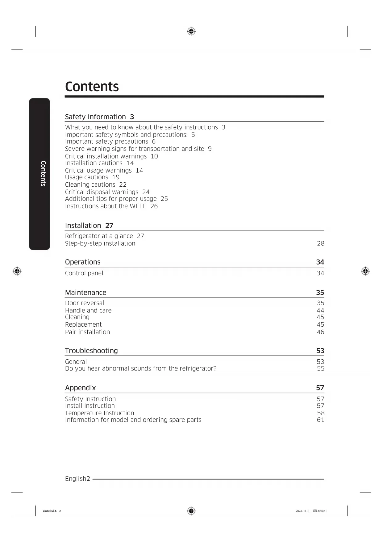 Refrigerator User manual Free Standing Appliance Untitled-6 1 2022-11-01 3:56:51English2 Contents Contents Safety information 3 What you need to know about the safety instructions 3 Important safety symbols and precautions: 5 Important safety precautions 6 Severe warning signs for transportation and site 9 Critical installation warnings 10 Installation cautions 14 Critical usage warnings 14 Usage cautions 19 Cleaning cautions 22 Critical disposal warnings 24 Additional tips for proper usage 25 Instructions about the WEEE 26 Installation 27 Refrigerator at a glance 27 Step-by-step installation 28 Operations 34 Control panel 34 Maintenance 35 Door reversal 35 Handle and care 44 Cleaning 45 Replacement 45 Pair installation 46 Troubleshooting 53 General 53 Do you hear abnormal sounds from the refrigerator? 55