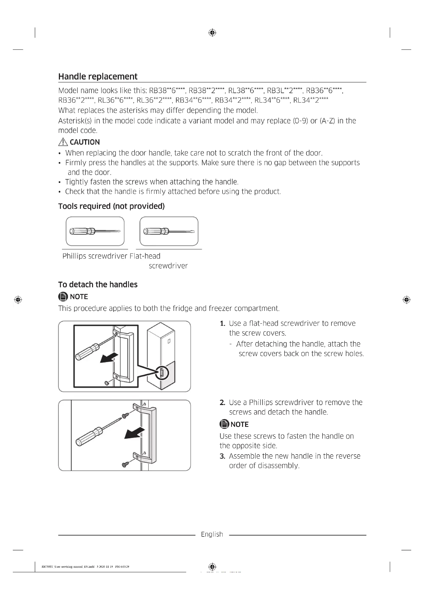 - Disconnect the power cord before reversing the doors. Tools required (not provided) Phillips screwdriver Flat-head screwdriver 11 mm spanner 10 mm socket wrench 8 mm socket wrench 10 mm spanner RB7300T_User-servicing-manual_EN.indd 5 2020-11-19 PM 6:03:31English Reversing the door NOTE For the models with handles, reverse the handles rst. (For detailed information, see the “Handle replacement (For models with bar handles)” section.)