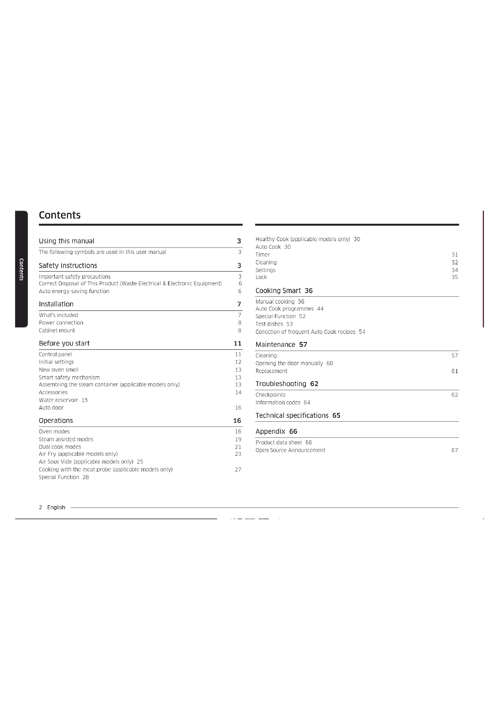 Product data sheet 66 Open Source Announcement 67 Contents Using this manual 3 The following symbols are used in this user manual 3 Safety instructions 3 Important safety precautions 3 Correct Disposal of This Product (Waste Electrical & Electronic Equipment) 6 Auto energy saving function 6 Installation 7 What’s included 7 Power connection 8 Cabinet mount 8 Before you start 11 Control panel 11 Initial settings 12 New oven smell 13 Smart safety mechanism 13 Assembling the steam container (applicable models only) 13 Accessories 14 Water reservoir 15 Auto door 16 Operations 16 Oven modes 16 Steam assisted modes 19 Dual cook modes 21 Air Fry (applicable models only) 23 Air Sous Vide (applicable models only) 25 Cooking with the meat probe (applicable models only) 27 Special Function 28English 3 Using this manual Safety instructions Installation of this oven must be performed only by a licensed electrician. The installer is responsible for connecting the appliance to the mains power supply in observance of the relevant safety recommendations.
