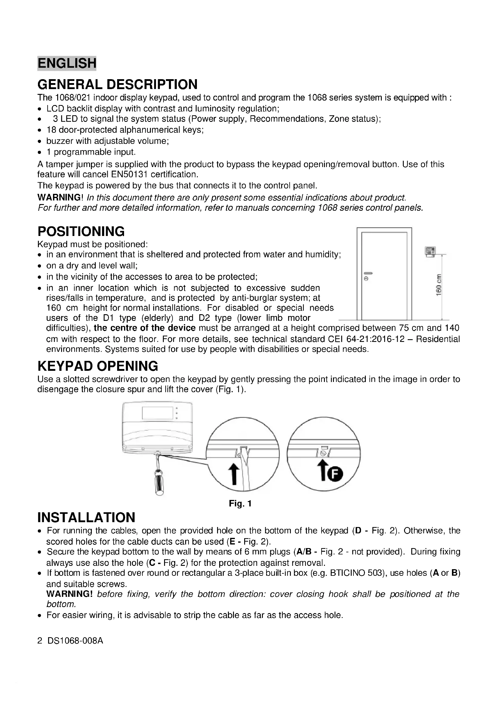 INSTALLATION For running the cables, open the provided hole on the bottom of the keypad (D - Fig. 2). Otherwise, the scored holes for the cable ducts can be used (E - Fig. 2). Secure the keypad bottom to the wall by means of 6 mm plugs (A/B - Fig. 2 - not provided). During fixing always use also the hole (C - Fig. 2) for the protection against removal. If bottom is fastened over round or rectangular a 3-place built-in box (e.g. BTICINO 503), use holes (A or B) and suitable screws. WARNING! before fixing, verify the bottom direction: cover closing hook shall be positioned at the bottom. For easier wiring, it is advisable to strip the cable as far as the access hole. Fig. 1DS1068-008A 3 Close the keypad by screwing the screw provided in the hole. (F - Fig. 1).