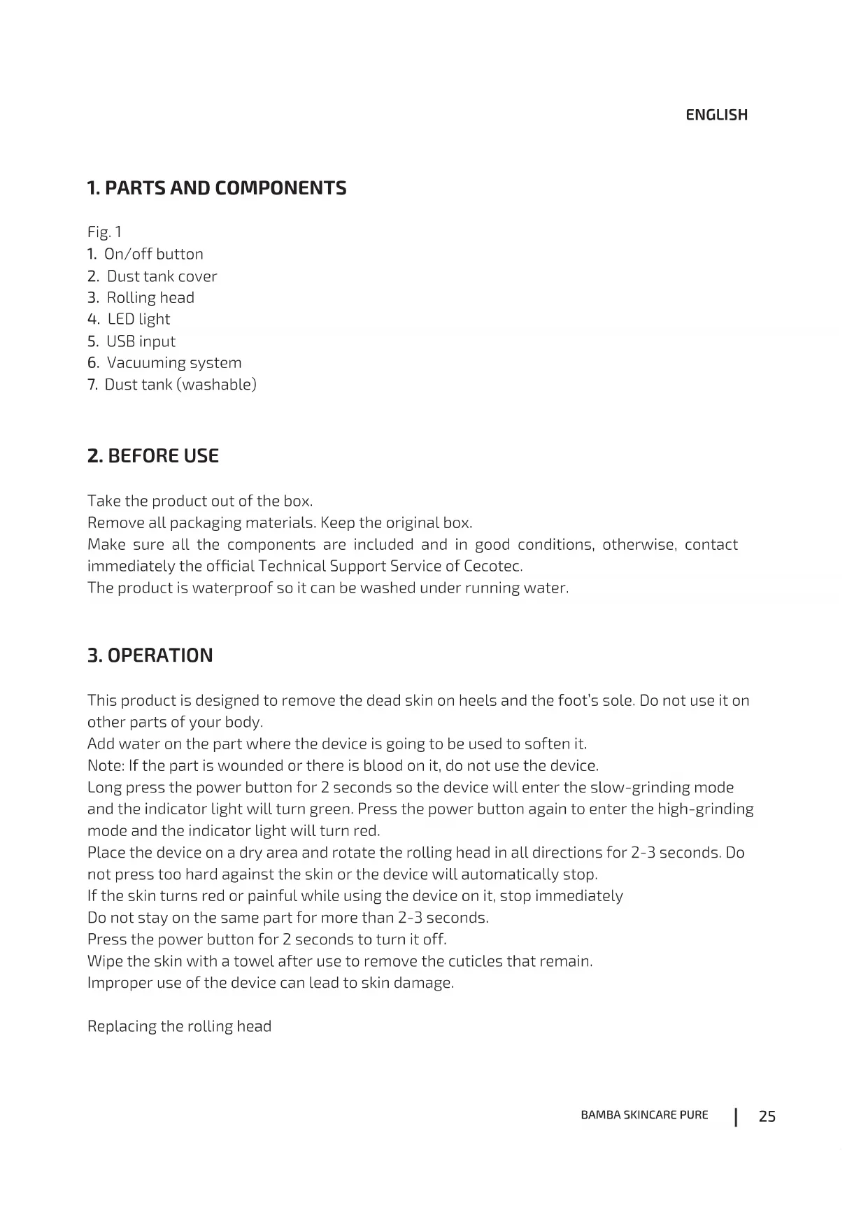 con capacidades físicas, sensoriales o mentales reducidas, o con falta de experiencia y conocimiento. Supervise a los niños para asegurarse de que no jueguen con el producto. SAFETY INSTRUCTIONS Read these instructions thoroughly before using the appliance. Keep this instruction manual for future reference or new users. Make sure that the mains voltage matches the voltage stated on the rating label of the appliance and that the wall outlet is grounded. This product is for household only. Do not use for commercial or industrial purposes. This device is intended for the treatment of feet only. For hygienic reasons, do not share this appliance with other people. Check results regularly during treatment. This is particularly advisable in the case of diabetics, as they are less sensitive to pain and are liable to become injured more easily. Always use with extreme care. If in doubt, ask your doctor. In case of prolonged intensive use, the appliance might get very hot. In order to prevent skin burns in these situations, there should be longer breaks between each application. Do not use the device if its cord or any other part is damaged. In this case, contact the ofcial Technical Support Service of Cecotec. Keep children away from the packaging materials. Risk of suffocation. The appliance must be checked frequently for signs of wear or damage. If such signs are present, of if the appliance has been used improperly, contact the ofcial Technical Support Service of Cecotec. Do not try to repair the device by yourself.BAMBA SKINCARE PURE