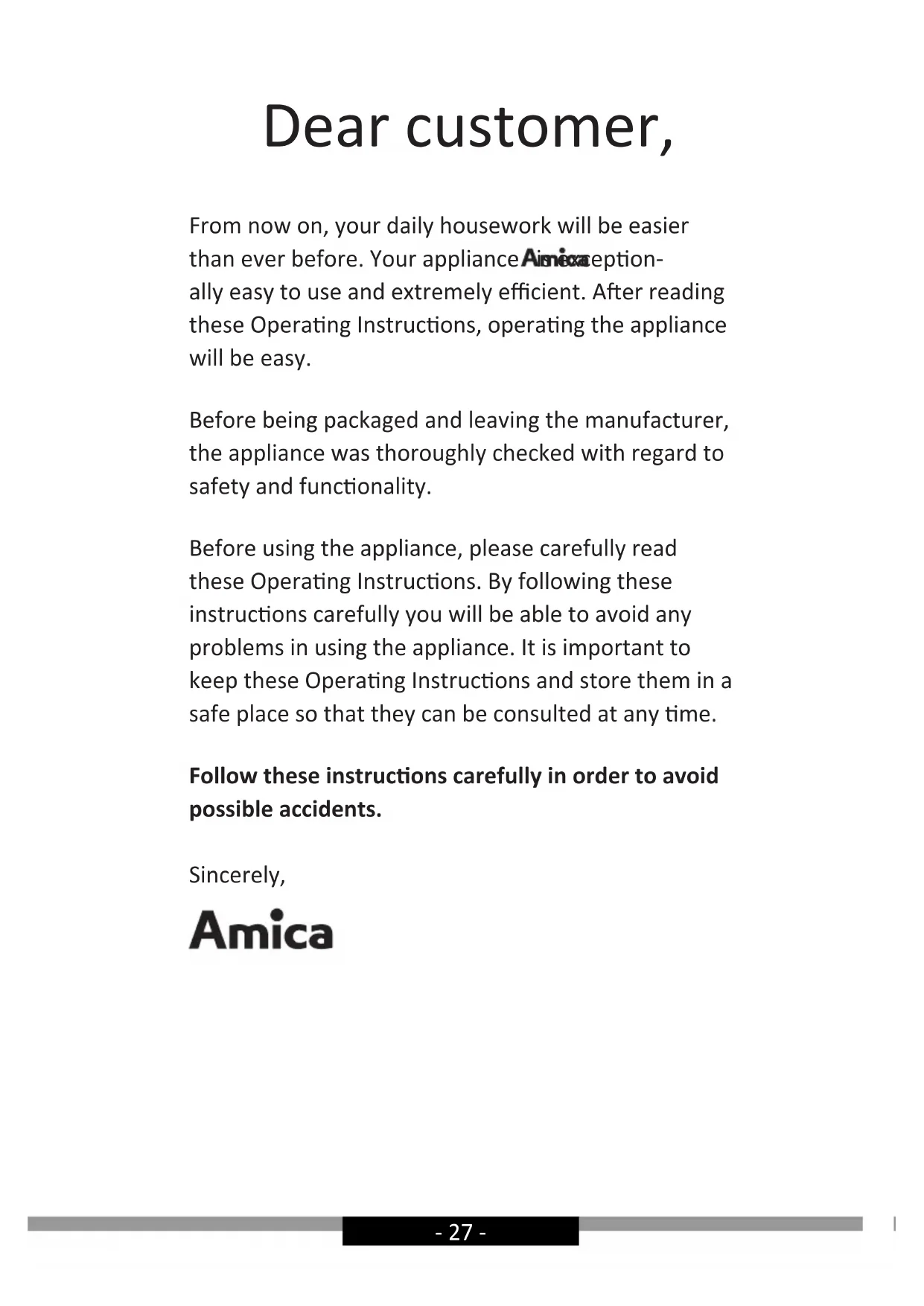 JAMSTVO 163 HR- Kazalo- 27 - Dear customer, From now on, your daily housework will be easier than ever before. Your appliance is excepon- ally easy to use and extremely ecient. Aer reading these Operang Instrucons, operang the appliance will be easy. Before being packaged and leaving the manufacturer, the appliance was thoroughly checked with regard to safety and funconality. Before using the appliance, please carefully read these Operang Instrucons. By following these instrucons carefully you will be able to avoid any problems in using the appliance. It is important to keep these Operang Instrucons and store them in a safe place so that they can be consulted at any me. Follow these instrucons carefully in order to avoid possible accidents. Sincerely,- 28 - GUIDELINES CONCERNING