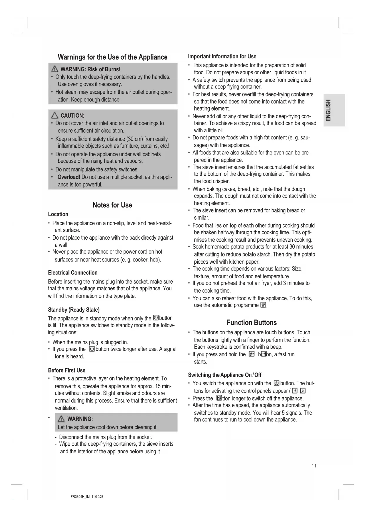 - After the time has elapsed, the appliance automatically switches to standby mode. You will hear 5 signals. The fan continues to run to cool down the appliance.FR3804H_IM 11.0 9.23
