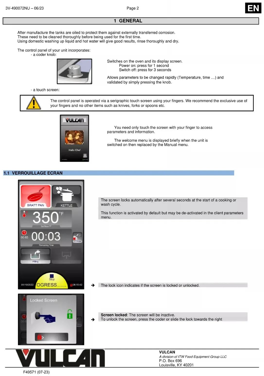 PLEASE NOTE THAT NO GUARANTEE IS UNCONDITIONAL Our guarantee applies only for normal use. That is, with the strict observance of the recommendations given in our instructions for use and maintenance. It will only be valid on condition that the periodical maintenance recommended has been carried out by factory trained engineers. All appliances are, subject to the above limitations, normally guaranteed for a period of one year, from the date invoice. In the event of a breakdown due to a visible or hidden defect, our equipment will be repaired at our expense, including parts and labour costs. To benefit from our guarantee, our appliances must not have been modified in any way or repaired using parts which are not genuine and approved for such use or where repairs have been undertaken by personnel who are not qualified, or factory trained. In case of breakdown or failure we should be informed in writing at the earliest opportunity of the nature of the problem. In no circumstances should the defect be remedied by the user or a third party. Regular service inspections and maintenance by our engineers are an essential condition for correct and reliable operation of our equipment. Such service and maintenance operations can and must only be carried out by our technicians, who are not only fully qualified but also trained to do so. They have the right tooling, original spare parts and are given regular training updates on the appliances. Periodic servicing is essential; it is carried out at a cost but guarantees reliable operation of our appliances The timing of service and maintenance is relative to the conditions of use. In the event of heavy use certain operations will need to be carried out more frequently. WARNING! Damage caused by connecting our appliances to a power supply which does not comply with the data plate (voltage, reversal of phase/neutral conductors...) or where phase order cannot be checked (this is important for three-phase motors, fan direction, electric rams...) will under no circumstances be covered by warranty. For this reason, we advise against connecting appliances until the electrical and gas supplies can be checked and compared with details on the data plate. F49571 (07-23)3V-490072NU – 06/23 Page 1