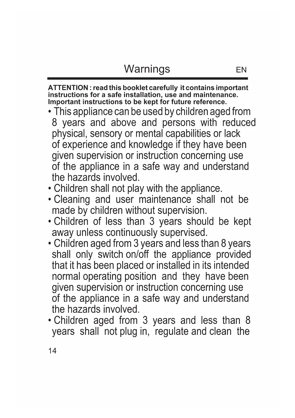 - Children aged from 3 years and less than 8 years shall not plug in, regulate and clean the EN15 appliance or perform user maintenance.