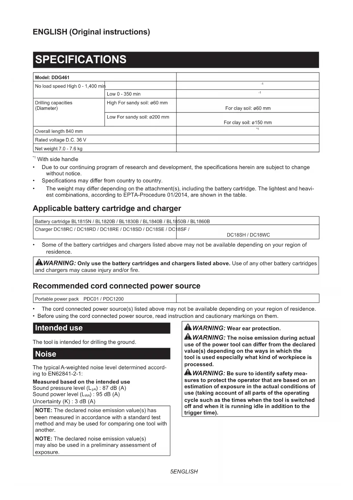 - Theweightmaydierdependingontheattachment(s),includingthebatterycartridge.Thelightestandheavi- estcombinations,accordingtoEPTA-Procedure01/2014,areshowninthetable. Applicable battery cartridge and charger Battery cartridge BL1815N/BL1820B/BL1830B/BL1840B/BL1850B/BL1860B Charger DC18RC/DC18RD/DC18RE/DC18SD/DC18SE/DC18SF/ DC18SH/DC18WC