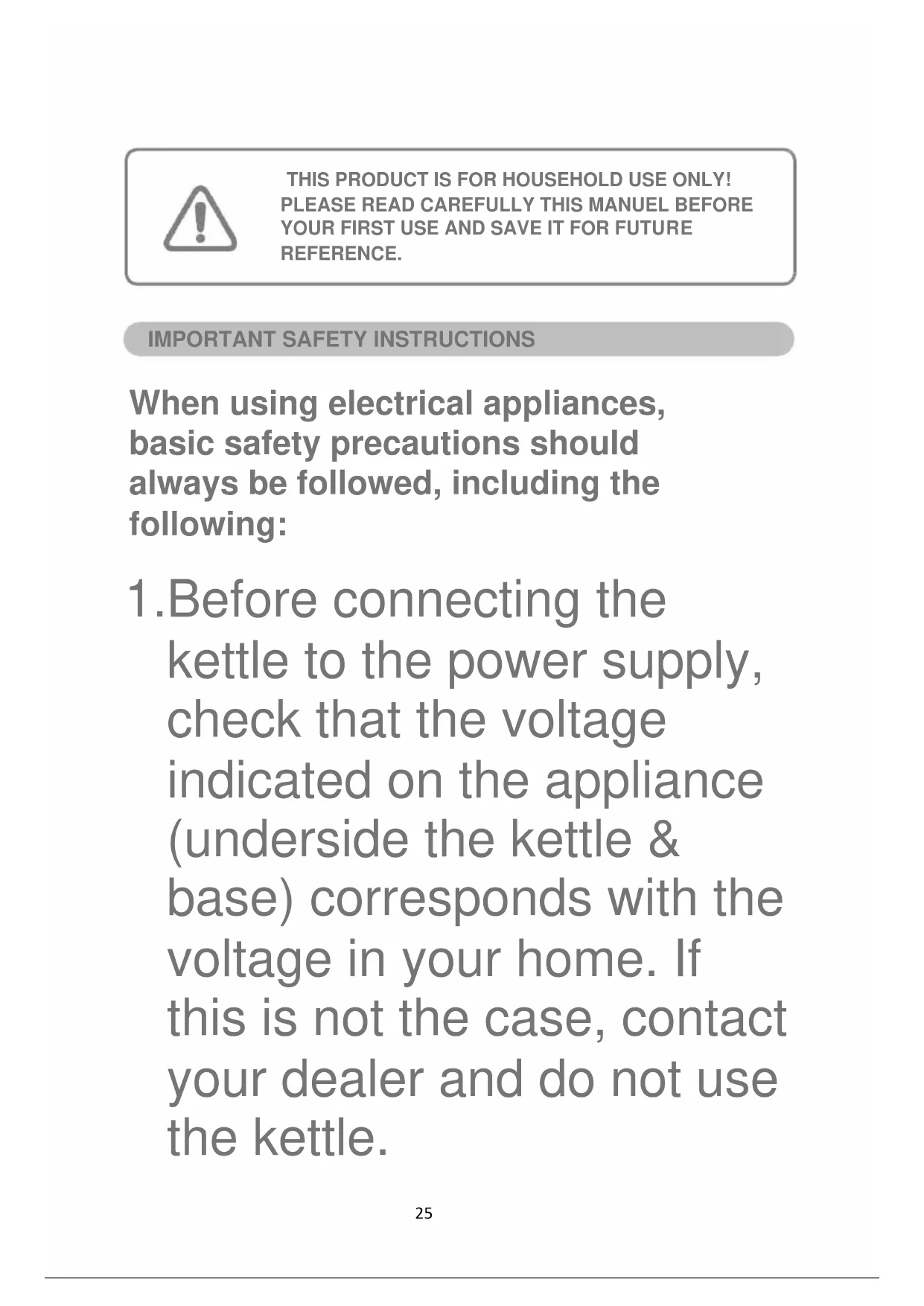 Before connecting the kettle to the power supply, check that the voltage indicated on the appliance (underside the kettle & base) corresponds with the voltage in your home. If this is not the case, contact your dealer and do not use the kettle.