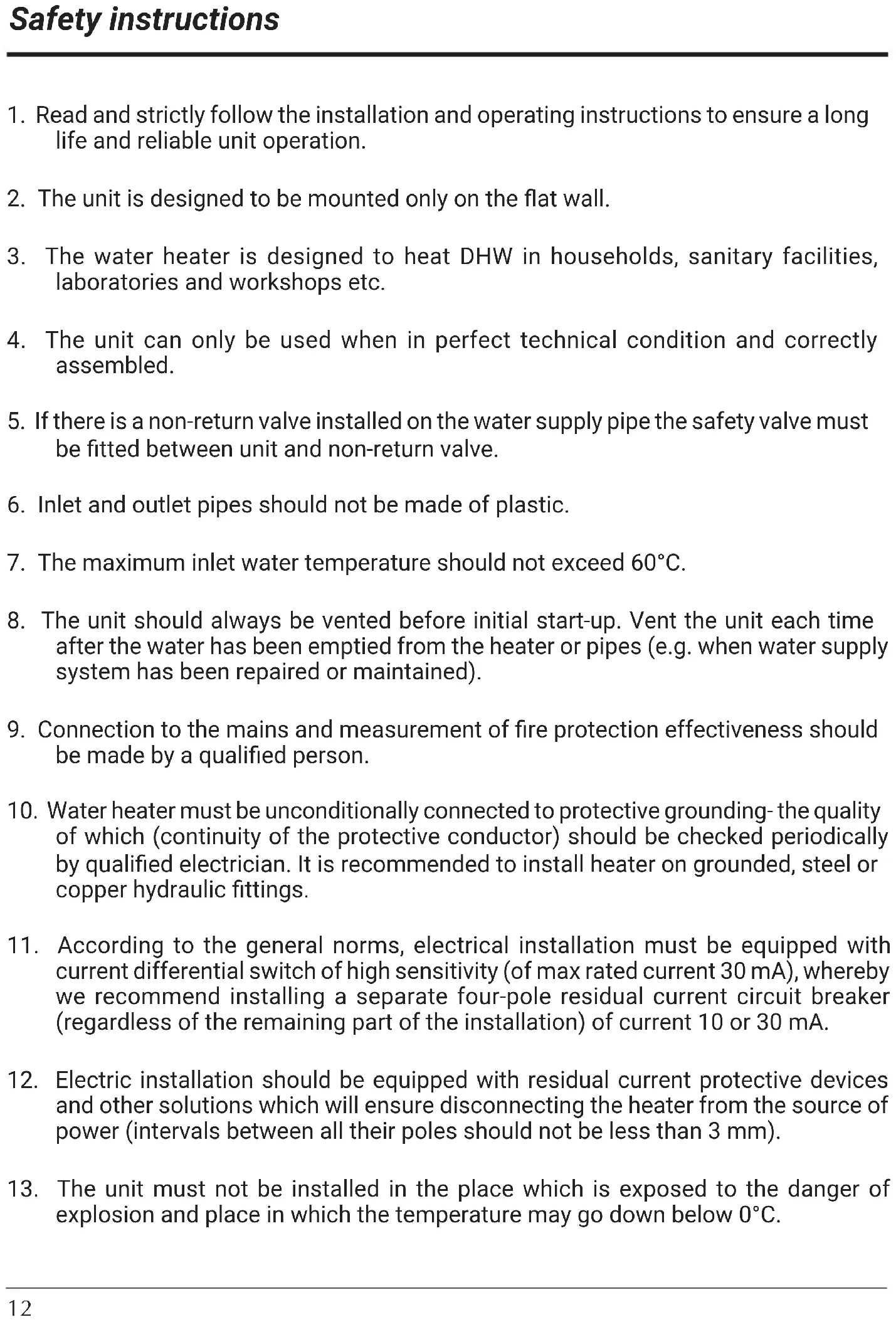 12. Electric installation should be equipped with residual current protective devices