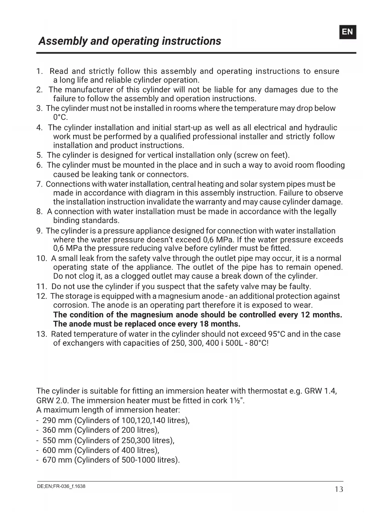 corrosion. The anode is an operating part therefore it is exposed to wear. The condition of the magnesium anode should be controlled every 12 months. The anode must be replaced once every 18 months.